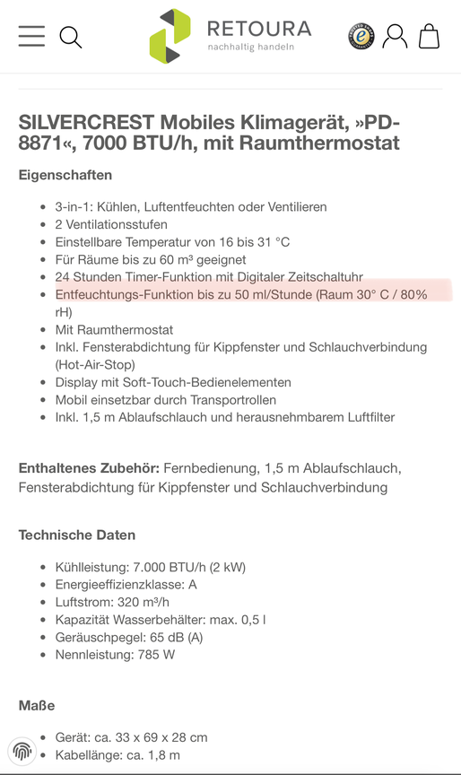 Habe ich den Abluftschlauch angeschlossen konnte das Gerät die RLF von etwa 65% auf 55% senken innerhalb von fast einer Stunde und gleichzeitig die Raumtemperatur senken von 21,5 auf 20,5C°.