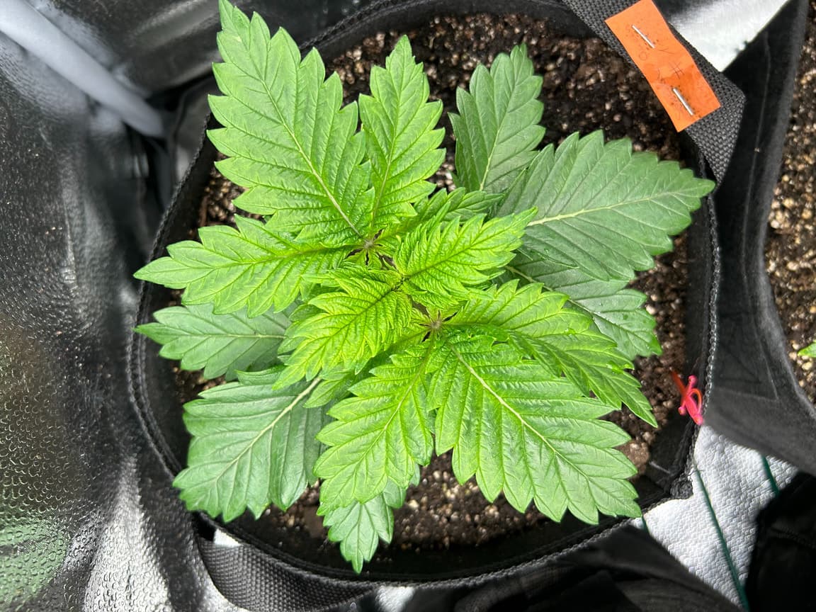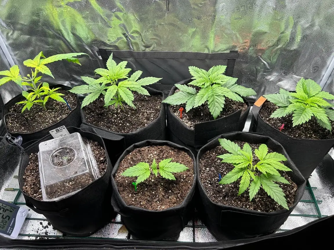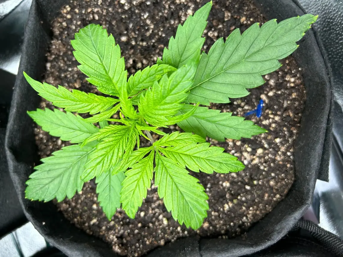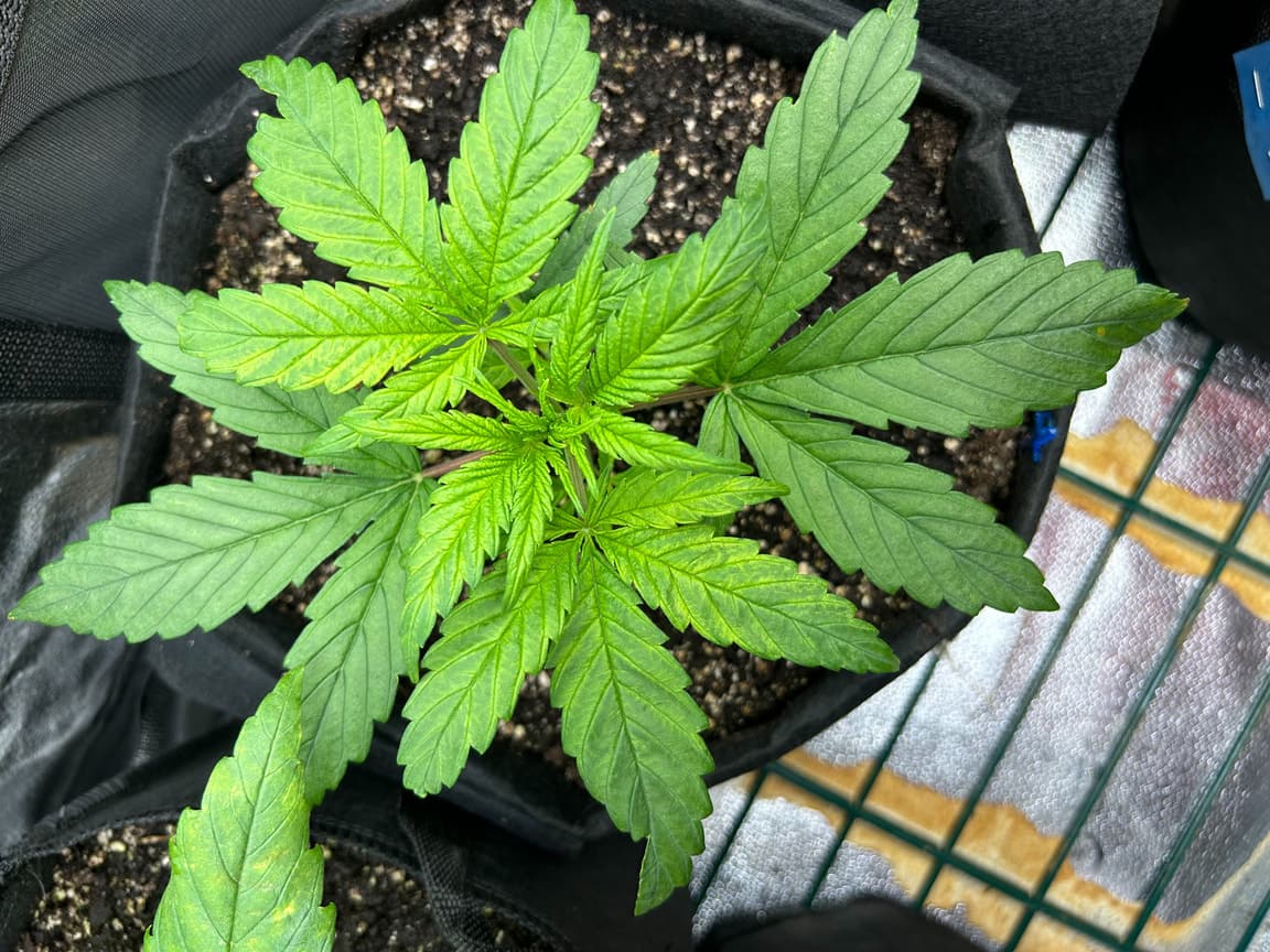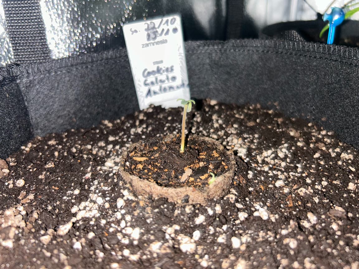 4x 15 Liter Smartpots von SpiderFarmer, 5x 10 Liter Smartpots aus dem Netz. Dünger von BioTabs, Alphaboost und BoomBoomSpray. Beim umtopfen dann der Gau schlechthin… zu wenig Lightmix… hab versucht, das Ganze durch ne Eigenkreation Erdmix zu ersetzen. Rate ich ab jetzt keinem mehr, außer derjenige weiß genau(!) was man tun muss und warum. Ich hatte erst keine Heizmatte drin, daraus resultiert einiges an Problemen. 1x Unbekannt ist eingegangen, die Critical hatte erhebliche Wuchsprobleme und die SweetCherry… naja. Die ist ein Fall für sich. Da ich Stecklinge schneiden möchte und einige der Damen (hoffentlich sind es alles ladies) extrem hinterher hinken, habe ich beschlossen, die wachstumsphase deutlich zu verlängern. Also am 22.10. noch ne CookiesGelato Automatik im Propagator platziert. Am 25.10. hat die dann einen Platz im Zelt bekommen, allerdings noch mit Haube gegen Zugluft. Die beiden Samen von SensiSeeds haben erhebliche Schwierigkeiten, liegt das an dem Strain oder an der Seedherstellung? Naja, die Critical erholt sich nach dem Skalpelleinsatz wieder, die SweetCherry habe ich ausgetopft (absolute Notlösung und nicht zu empfehlen), sehr wenige Wurzeln waren an der Pflanze. der Wuchs war allerdings so beschissen dass ich eine neue SweetCherry gestartet habe. Allerdings dieses Mal im Wohnzimmer unter ner 10w AquariumLED. Damit die Wurzeln keinen Umtopfstress bekommen, wandern seit dem alle Mädels in cocostöpfechen (6cm Durchmesser) gefüllt mit Anzuchterde. Sobald die „Einfinger-Blätter“ größer als die Keimblätter sind, wird umgezogen. Vom Propagatorminitopf in das erste eigene Zuhause (6cm Cocotopf). So war das dann auch bei der Automatik und der 2. SweetCherry. Jetzt rennt alles. Allerdings sind die Damen scheinbar nicht richtig versorgt. Blattzeichnungen, krüppelwuchs und so weiter könnten auch pH-Wert bedingt sein. Hier ist das Wasser zwischen 7,2 und 7,9 also nicht wirklich tragbar. Um den pH-Wert zu senken ist das Alphaboost völlig ausreichend, denke trotzdem dass etwas schief läuft. Momentan und noch 9(!) Wochen lang läuft die veggi-Phase mit 18/6 , 60-75 cm Abstand auf 60%LED-leistung. Die erste unbekannte, mit dem sehr hellen und kräftigen Wuchs, wurde per Schere gefimmt. Alle anderen wurden zumindest von unten schon beschnitten, kaputte krüppelige sonnensegel und die winztriebe ab. Temperatur schwankt zwischen 18 (Licht aus) und 24 Grad C. Relative Luftfeuchtigkeit zwischen 55 und 75%. Sobald die Lampen ausgehen werden die Blätter mit boomboomspray behandelt. Gegossen wird Wasser das mit Alphaboost auf 6,2-6,4 pH gebracht wird. Ca 1,5 ml/1 Liter. Gießen per Hand, abwechselnd rechts/links von der Pflanze. So kann eine Seite atmen und eine Seite saufen. Nur die Auto bekommt noch etwas wenig Wasser (ca 20 ml per Spritze)und das deswegen direkt in den cocotopf. In zwei oder drei Tagen (sobald die ersten Blätter ne gute Fläche entwickelt haben) kommt die Gewächshaushaube runter und es wird nur noch vom Topfrand bis zum cocotopf gegossen, damit der durchwurzelt wird. Was haltet ihr von meinem Setup, was würdet ihr ändern? Was könnte nötig sein? Was passiert eigentlich mit der Automatik wenn ich in 6-8 Wochen auf 12/12 stellen würde?