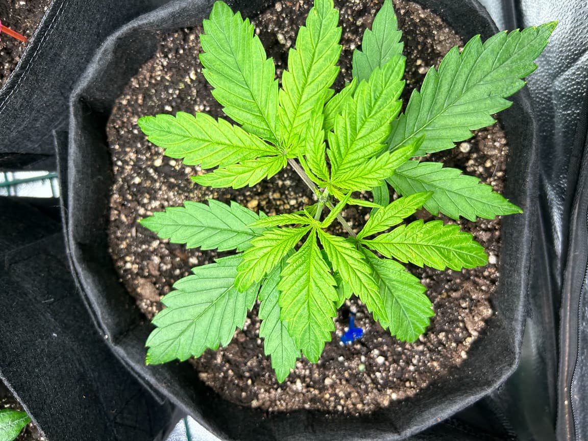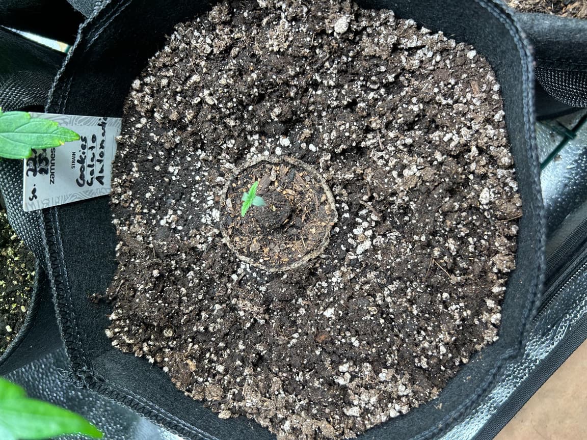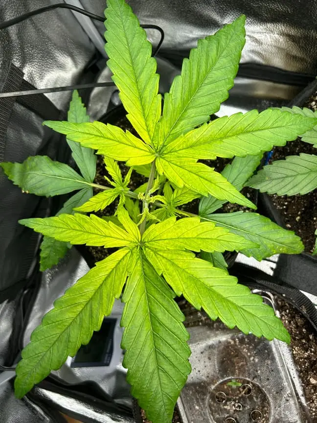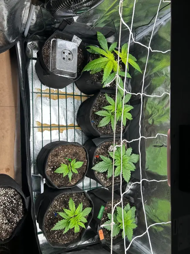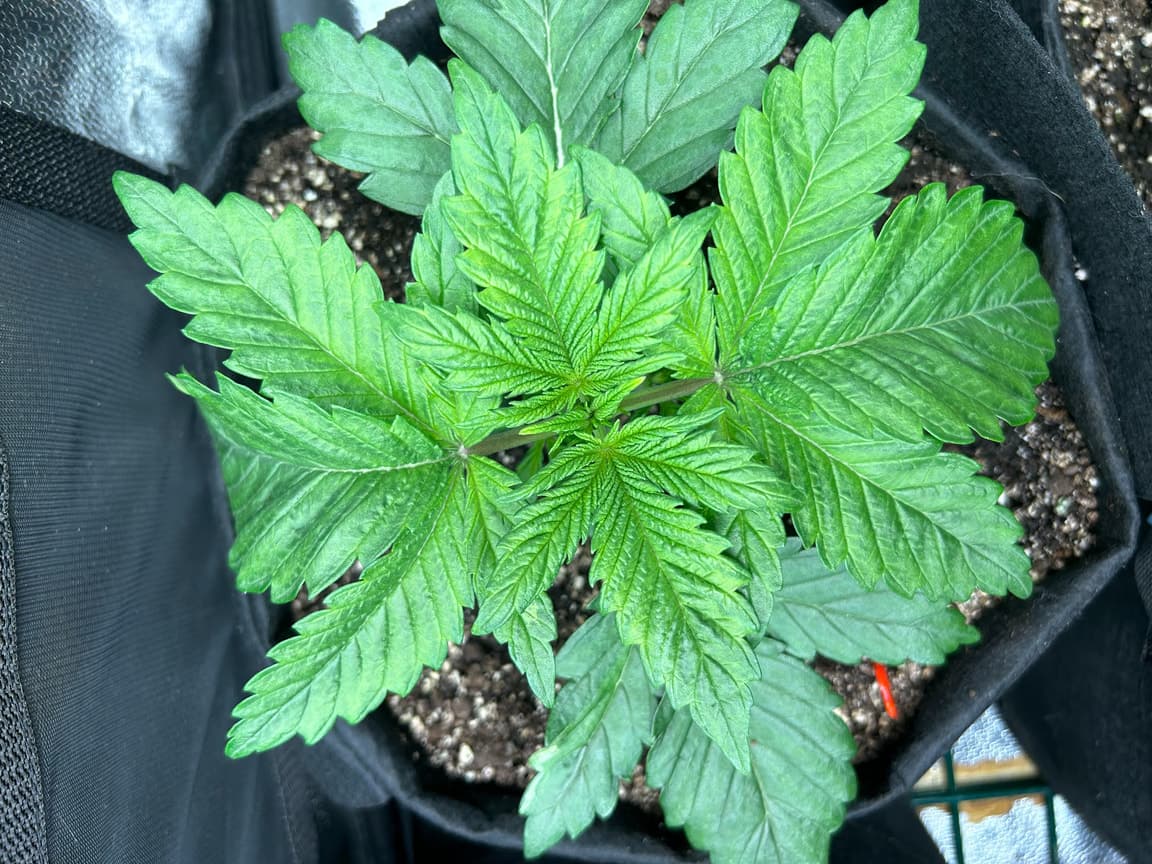 4x 15 Liter Smartpots von SpiderFarmer, 5x 10 Liter Smartpots aus dem Netz. Dünger von BioTabs, Alphaboost und BoomBoomSpray. Beim umtopfen dann der Gau schlechthin… zu wenig Lightmix… hab versucht, das Ganze durch ne Eigenkreation Erdmix zu ersetzen. Rate ich ab jetzt keinem mehr, außer derjenige weiß genau(!) was man tun muss und warum. Ich hatte erst keine Heizmatte drin, daraus resultiert einiges an Problemen. 1x Unbekannt ist eingegangen, die Critical hatte erhebliche Wuchsprobleme und die SweetCherry… naja. Die ist ein Fall für sich. Da ich Stecklinge schneiden möchte und einige der Damen (hoffentlich sind es alles ladies) extrem hinterher hinken, habe ich beschlossen, die wachstumsphase deutlich zu verlängern. Also am 22.10. noch ne CookiesGelato Automatik im Propagator platziert. Am 25.10. hat die dann einen Platz im Zelt bekommen, allerdings noch mit Haube gegen Zugluft. Die beiden Samen von SensiSeeds haben erhebliche Schwierigkeiten, liegt das an dem Strain oder an der Seedherstellung? Naja, die Critical erholt sich nach dem Skalpelleinsatz wieder, die SweetCherry habe ich ausgetopft (absolute Notlösung und nicht zu empfehlen), sehr wenige Wurzeln waren an der Pflanze. der Wuchs war allerdings so beschissen dass ich eine neue SweetCherry gestartet habe. Allerdings dieses Mal im Wohnzimmer unter ner 10w AquariumLED. Damit die Wurzeln keinen Umtopfstress bekommen, wandern seit dem alle Mädels in cocostöpfechen (6cm Durchmesser) gefüllt mit Anzuchterde. Sobald die „Einfinger-Blätter“ größer als die Keimblätter sind, wird umgezogen. Vom Propagatorminitopf in das erste eigene Zuhause (6cm Cocotopf). So war das dann auch bei der Automatik und der 2. SweetCherry. Jetzt rennt alles. Allerdings sind die Damen scheinbar nicht richtig versorgt. Blattzeichnungen, krüppelwuchs und so weiter könnten auch pH-Wert bedingt sein. Hier ist das Wasser zwischen 7,2 und 7,9 also nicht wirklich tragbar. Um den pH-Wert zu senken ist das Alphaboost völlig ausreichend, denke trotzdem dass etwas schief läuft. Momentan und noch 9(!) Wochen lang läuft die veggi-Phase mit 18/6 , 60-75 cm Abstand auf 60%LED-leistung. Die erste unbekannte, mit dem sehr hellen und kräftigen Wuchs, wurde per Schere gefimmt. Alle anderen wurden zumindest von unten schon beschnitten, kaputte krüppelige sonnensegel und die winztriebe ab. Temperatur schwankt zwischen 18 (Licht aus) und 24 Grad C. Relative Luftfeuchtigkeit zwischen 55 und 75%. Sobald die Lampen ausgehen werden die Blätter mit boomboomspray behandelt. Gegossen wird Wasser das mit Alphaboost auf 6,2-6,4 pH gebracht wird. Ca 1,5 ml/1 Liter. Gießen per Hand, abwechselnd rechts/links von der Pflanze. So kann eine Seite atmen und eine Seite saufen. Nur die Auto bekommt noch etwas wenig Wasser (ca 20 ml per Spritze)und das deswegen direkt in den cocotopf. In zwei oder drei Tagen (sobald die ersten Blätter ne gute Fläche entwickelt haben) kommt die Gewächshaushaube runter und es wird nur noch vom Topfrand bis zum cocotopf gegossen, damit der durchwurzelt wird. Was haltet ihr von meinem Setup, was würdet ihr ändern? Was könnte nötig sein? Was passiert eigentlich mit der Automatik wenn ich in 6-8 Wochen auf 12/12 stellen würde?