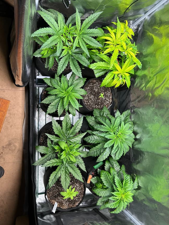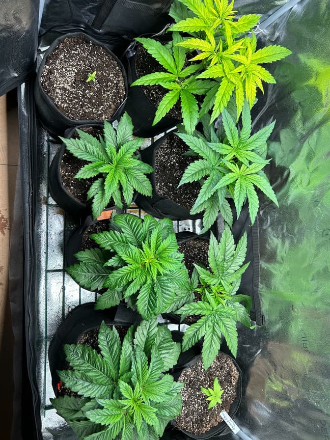 Die Automatik wird wohl ein rohrkrepierer. Zu früh an der zu scharfen Erde. Deutlich an den Blättern zu sehen. Werde daraus lernen und die restlichen Autos nur noch Sortenrein growen. Das wäre ein guter Gewächshausbesatz. Den anderen geht es prächtig, die critical sieht immer besser aus und die Unbekannten scheinen noch nie was von „Schnittschock“ gehört zu haben. Eigentlich wäre morgen die Umstellung auf 12/12, werde aber noch warten. Die 5. veg-Woche hat begonnen und deswegen ist laut Plan 1x 500ml NL (1ml Dünger + 0,5l Wasser) verfüttert worden. Die Automatik und die SweetCherryKush wurden nicht gedüngt weil später eingepflanzt.