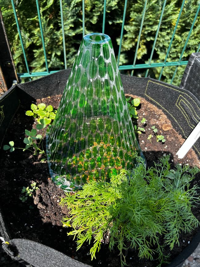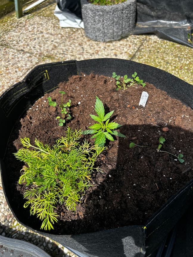1x Do-Si-Dos Automatik plus Kamille, 2x Knoblauch und Luzerne. Zitronenmelisse und Lavendel werden noch dazukommen.