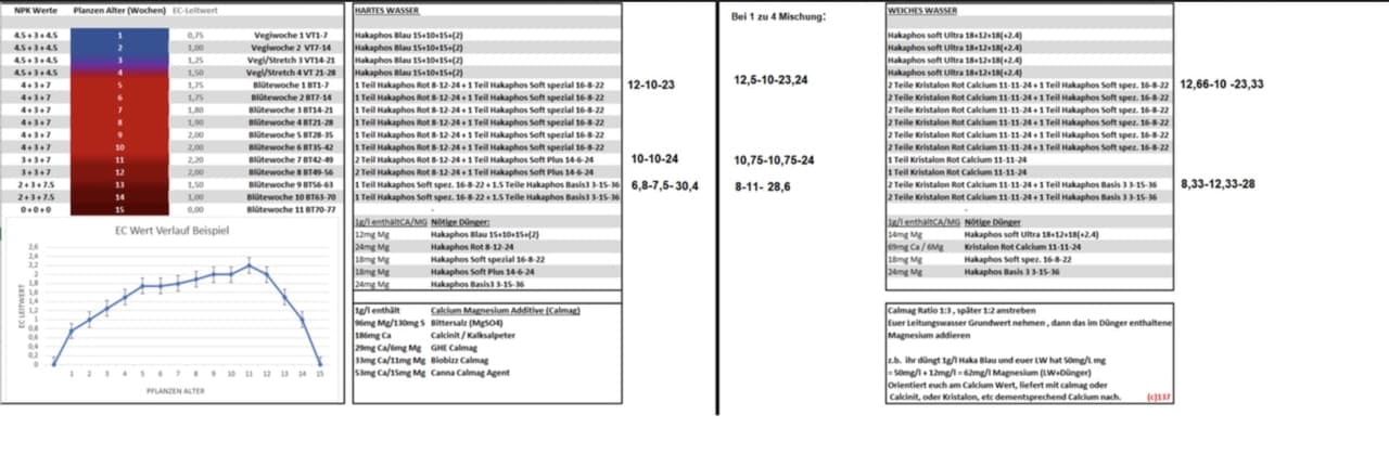 - Hakaphos soft Novell 11+11+30(+3) für die Blütephase. Also in der Blütepahse die beiden Salze mischen und von Woche zu Woche die Anteile des Hakaphos soft Novell erhöhen.