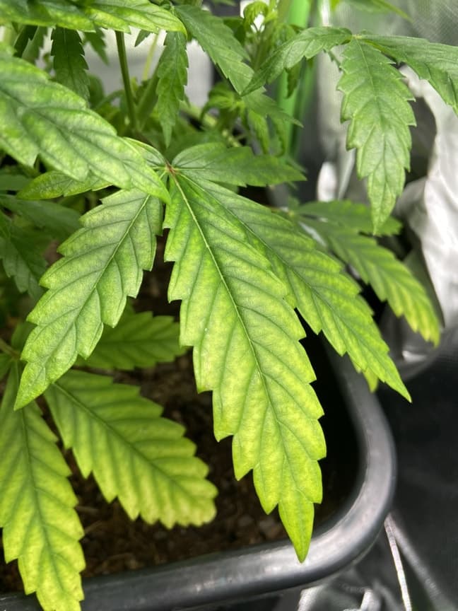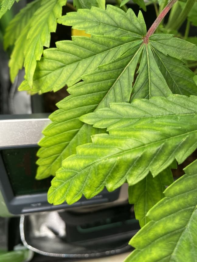 Nun zeigen auch die Sonnensegel von den Seitentrieben einen leichten Mg Mangel, wobei nur die unteren Blätter betroffen sind. Wie würdet ihr weiter vorgehen: