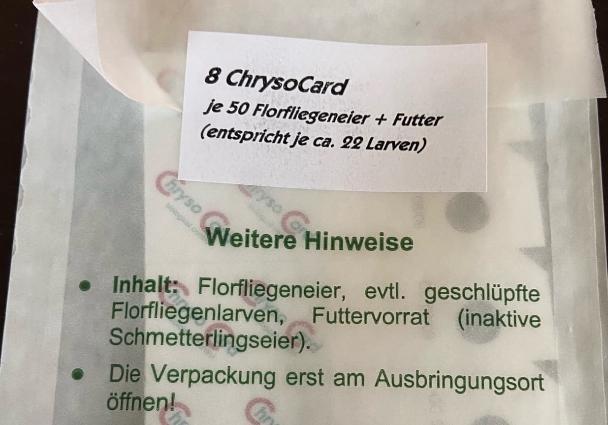 Also die Produktbezeichnung lautet "ChrysoCard Florfliegeneier". Ich denke, dass sind die, die ihr meint. Also einfach an die Pflanze hängen?
