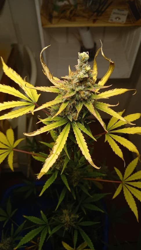 Seit 3 Wochen entwickeln sich die Buds nicht wirklich weiter. Trichome sind immernoch durchsichtig, vereinzelt milchig. Mit dem THC-Gehalt der oberen Buds bin ich an sich zufrieden (Habe eine kleine Bud vor dem Lüfter getrocknet und probiert). Trauermückenbefall seit einer Woche, mittlerweile ganz gut im Griff. Erde ist nicht mehr wirklich im Topf, Wasser fließt sofort durch auch nach 4 Tagen ohne Wasser und knacketrockener Erde. Blätter fingen vor 2-3 Wochen an gelb zu werden und Blätterspitzen rollen sich nach oben.