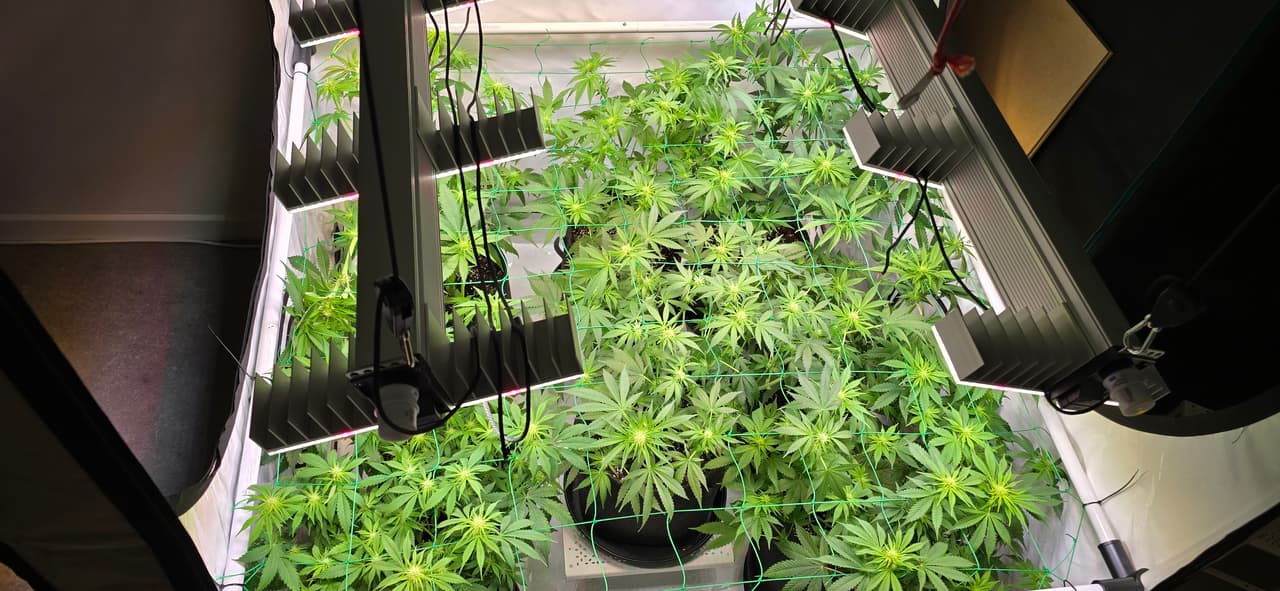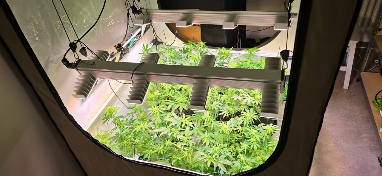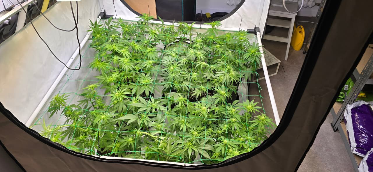 Zusätzlich hab ich diesmal ein netz eingezogen, damit das gewicht der buds die stängel nicht umknickt und ich die pflanzen auf einer höhe halten kann, weil die seriosa ist allen davon gerannt.