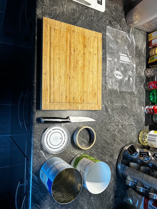 - zwei leere Dosen (am besten seitlich geöffnet, mit diesem „ich-schneide-mich-nicht-am-Blech“-Dosenöffner)
