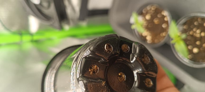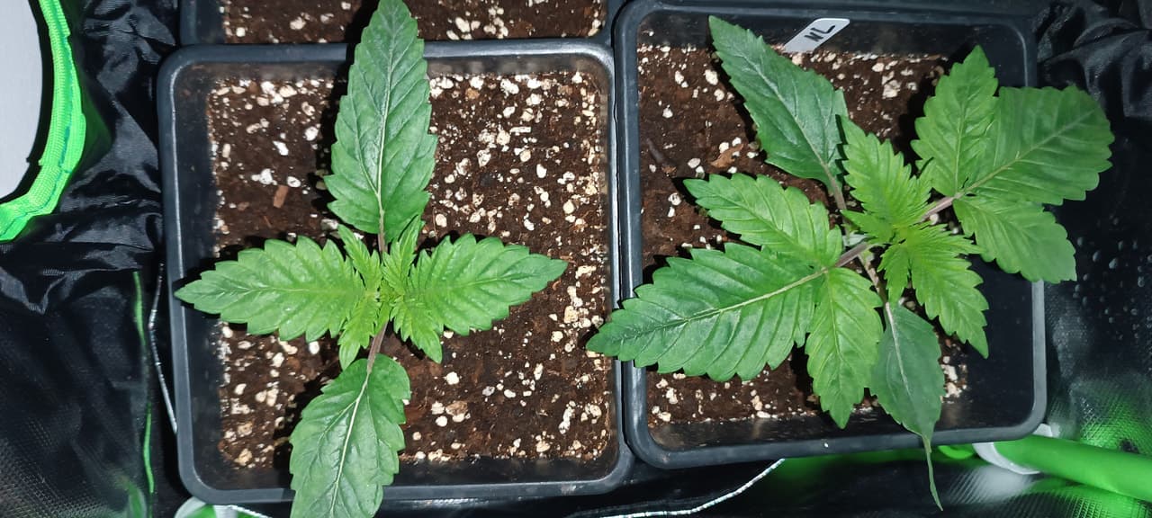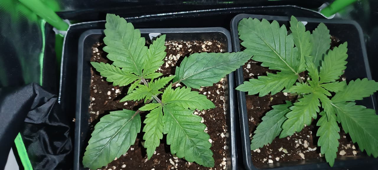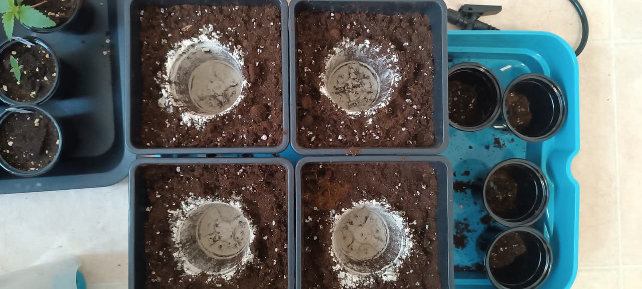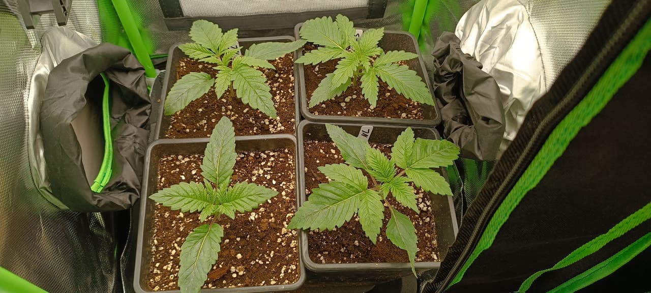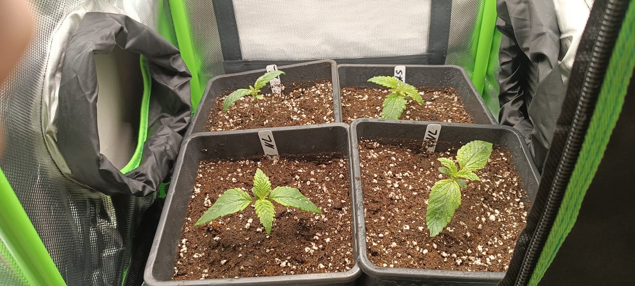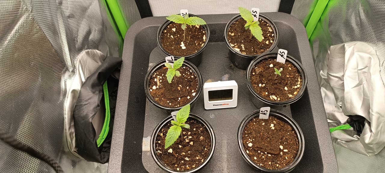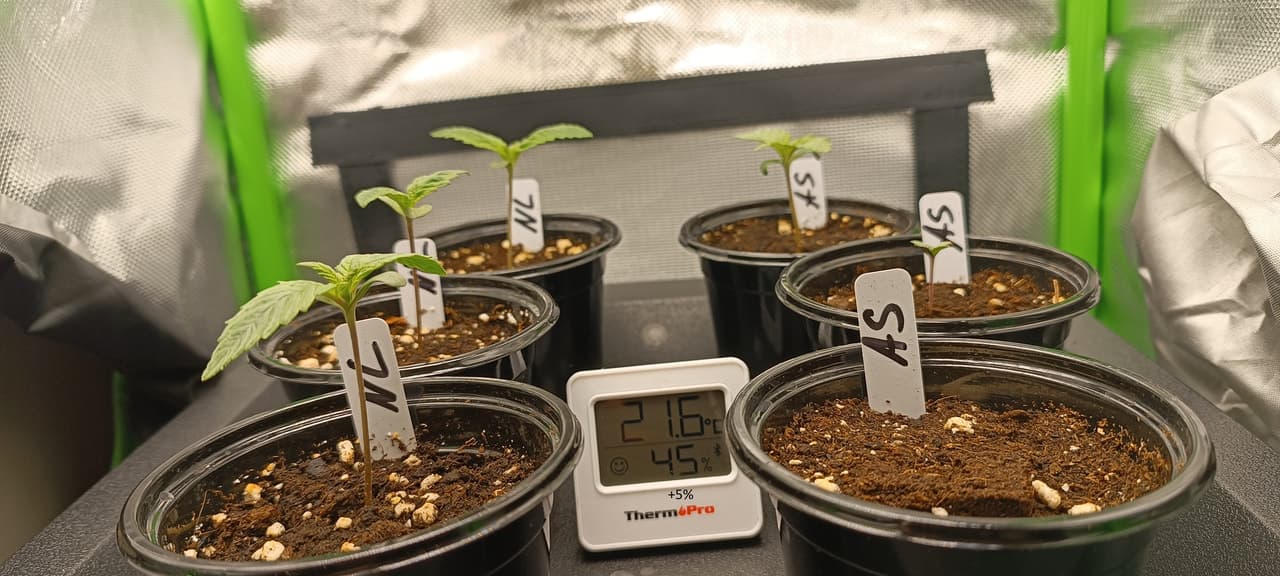 "Überlebt" haben 3x Northern Light und eine Afghan Skunk. Gegossen habe ich LW mit pH 6,5. Erst mit einem Pumpsprüher ~250ml und dann nochmal mit einem Glas, weitere 250ml. Die Töpfe fühlen sich schwer genug an für die ~ erste Woche. Die Lampe hängt 40cm drüber, Umluft ist noch aus.