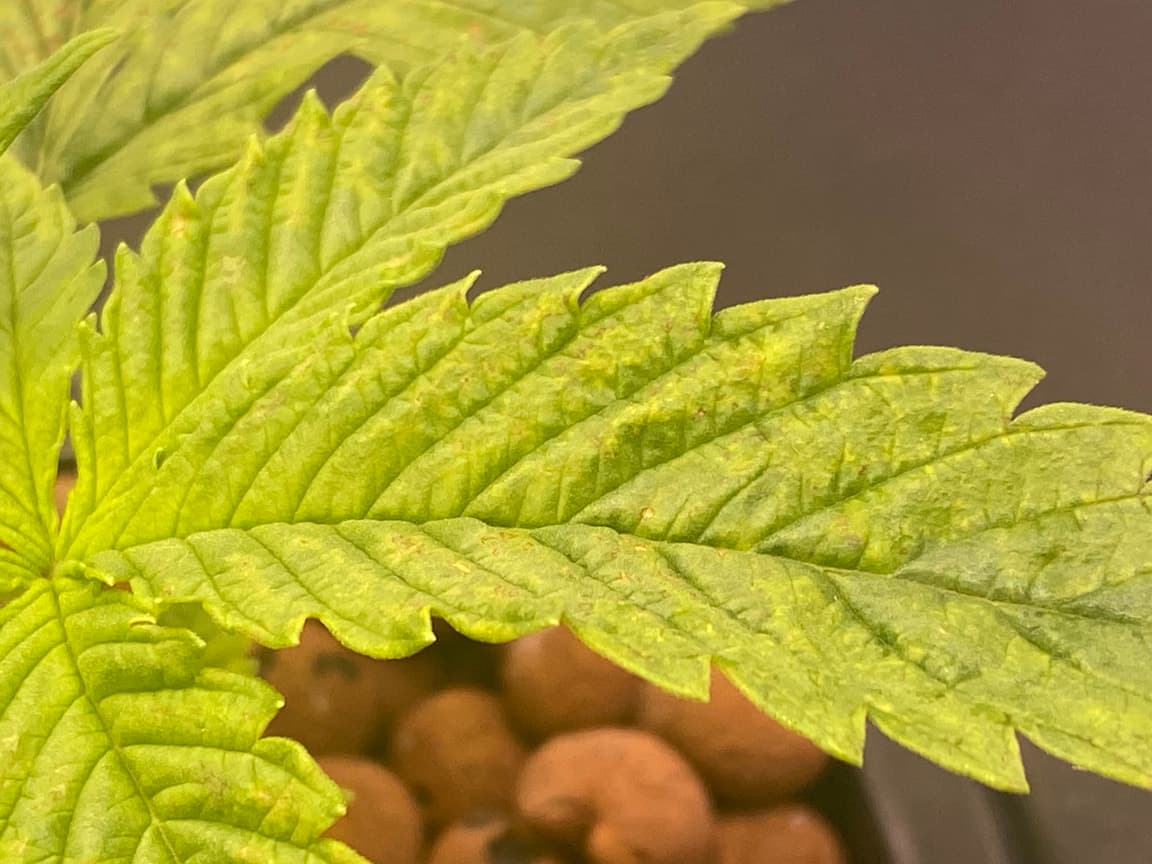 Was du bei Thrips als erstes bemerkst, ist der Fensterfraß. Die Dinger sind wie kleine Raupen und nagen die Blattoberseite zwischen den feinen Blattrippen weg. Dazu kommen dann Kackekrümel und Viruskrüppelei, den Thripse übertragen Viren wie TMV.