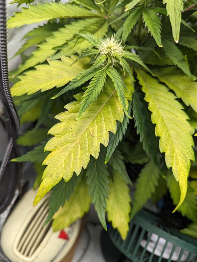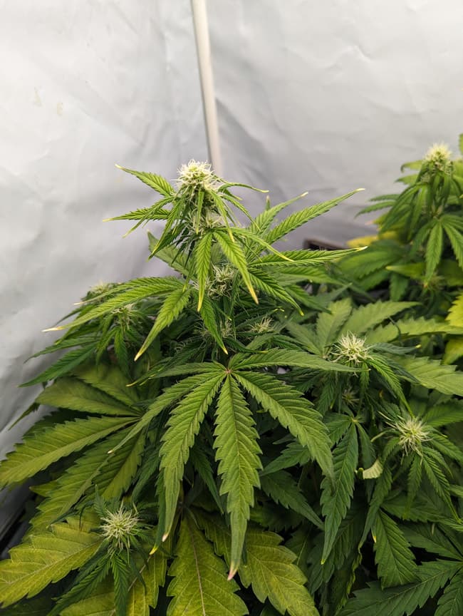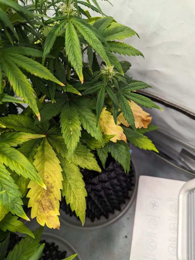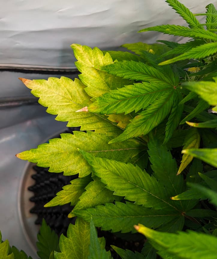 Allgemein ein paar untere Blätter oder welche die nicht ao sehr mit Licht gesegnet wurden zeigen leichte verfärbung (Hell/Gelb/Rost).