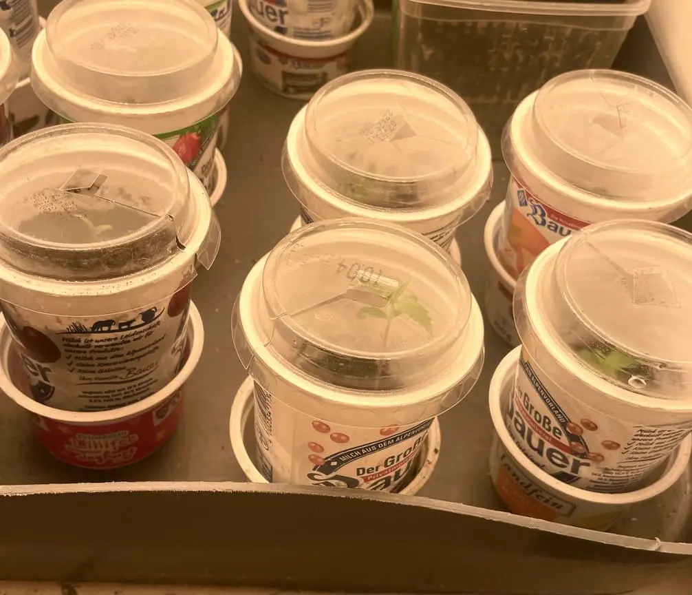 Ich plane die Keimung in feuchten Küchenpapier zu starten und die Dunkelheit durch eine darüber gestülpte Tasse zu verwirklichen..