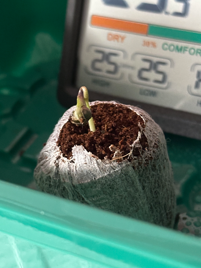 Für mich sieht das aus als ob der Samen zu flach in der Erde lag oder gar obendrauf, der Keimling konnte die Samenhülle nicht abstreifen und die Wurzel ist teilweise aus der Erde rausgeschoben . Das macht jetzt erstmal nicht viel, wenn Du den umtopfst setzt Du ihn einfach tiefer.