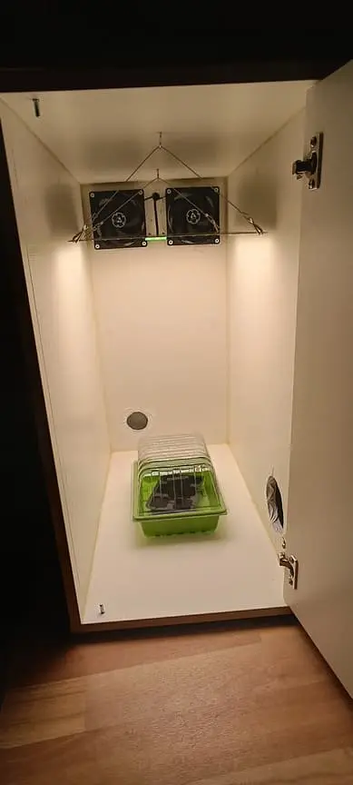 Ich dachte entweder an E27 Glüh-Obst oder mein Reserve-65W-Panel und Abluft ohne Filter durch ein bis zwei 120er oder 140er PC Lüfter.