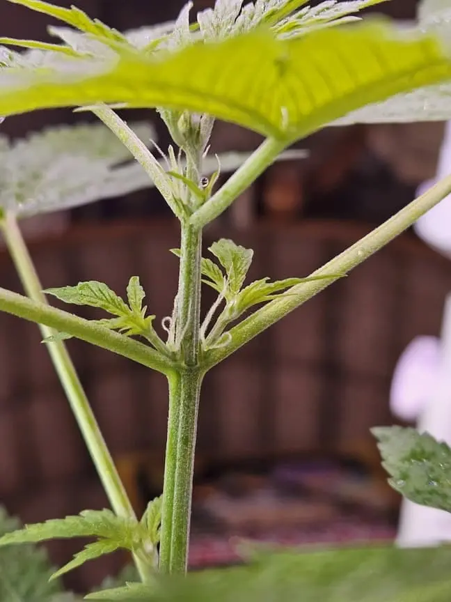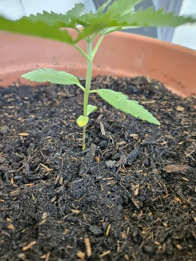 Nun fällt mir auf, das der Stamm unter den 2 Blättchen relativ dünn ist. Nach oben hin wird er dicker. Die Blätter selbst wachsen wie verrückt, aber ich meine das die Pflanze nicht mehr recht nach oben will.