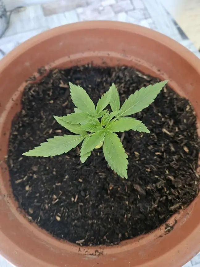 Am 25.04 kamen die ersten 2 Blättchen, seitdem ist sie eigentlich gut gewachsen. Ich habe sie vor 3 Tagen von einem 11 cm Topf in einen 28 cm Topf mit 28cm Durchmesser umgetopft.