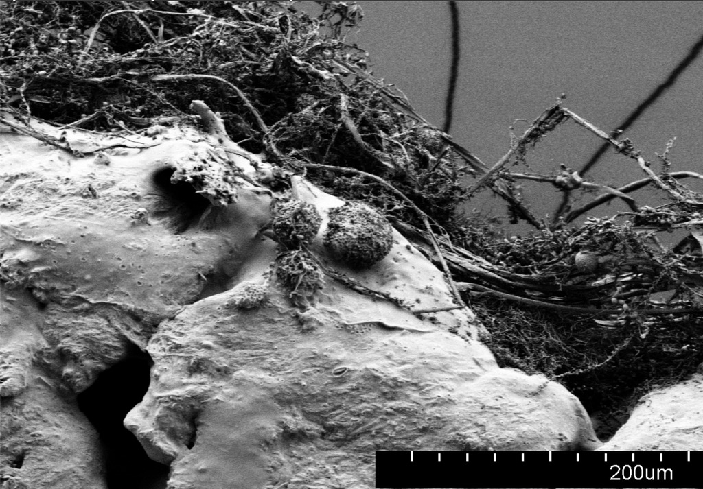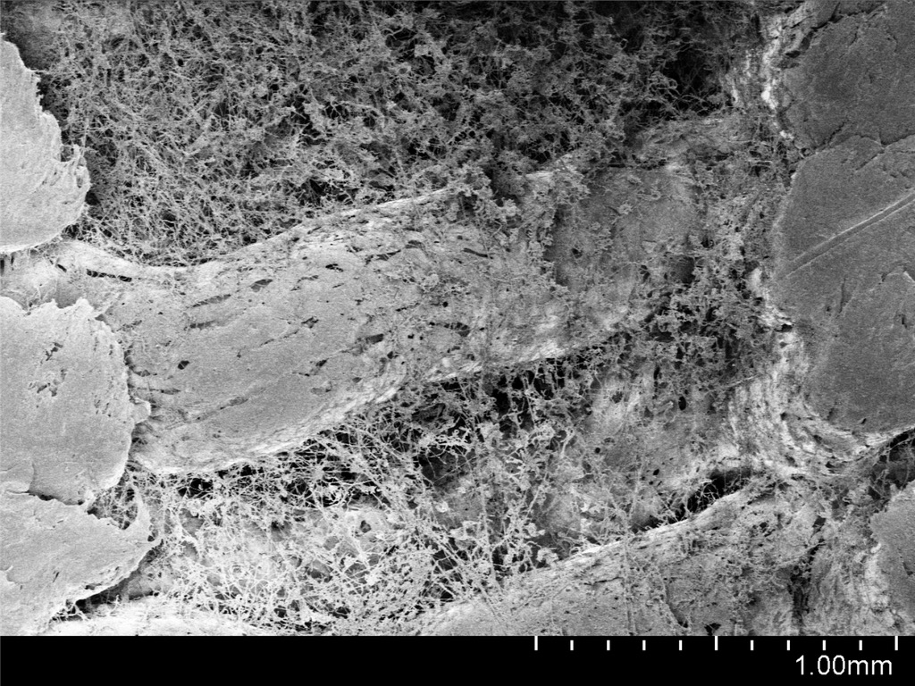- Schimmelpilze wachsen durch die offenzelligen Kapillaren und bilden ein Myzel.