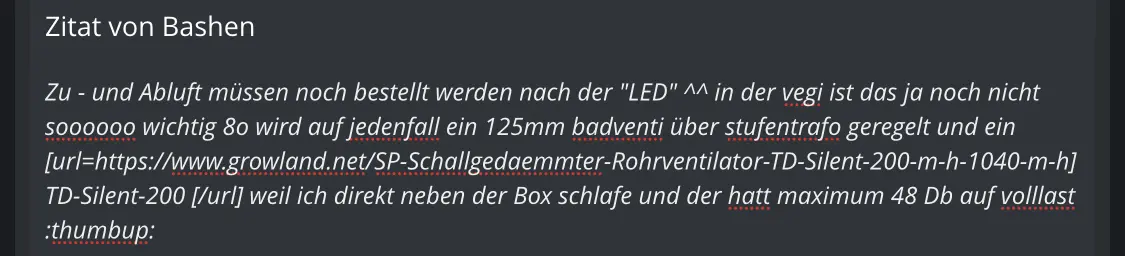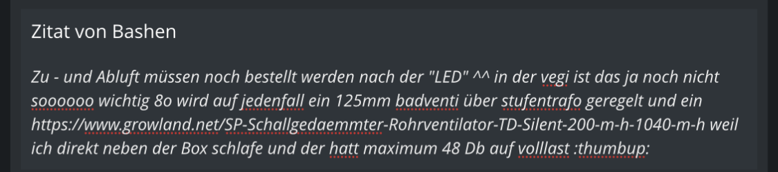 wird auf jedenfall ein 125mm badventi über stufentrafo geregelt und ein Rohrventie weil ich direkt neben der Box schlafe und der hatt maximum 48 Db auf volllast ![]()