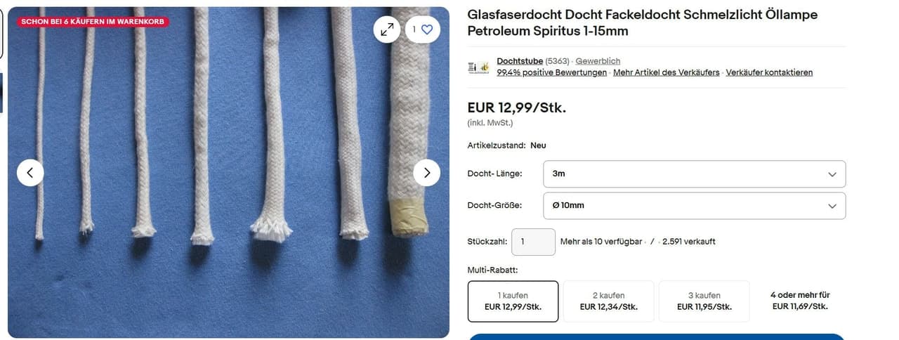 Als Docht habe ich mich auf 10mm Glasfaser eingeschossen. Das soll sehr gut leiten, weniger Salze festhalten und nicht wie Baumwolle weggammeln.