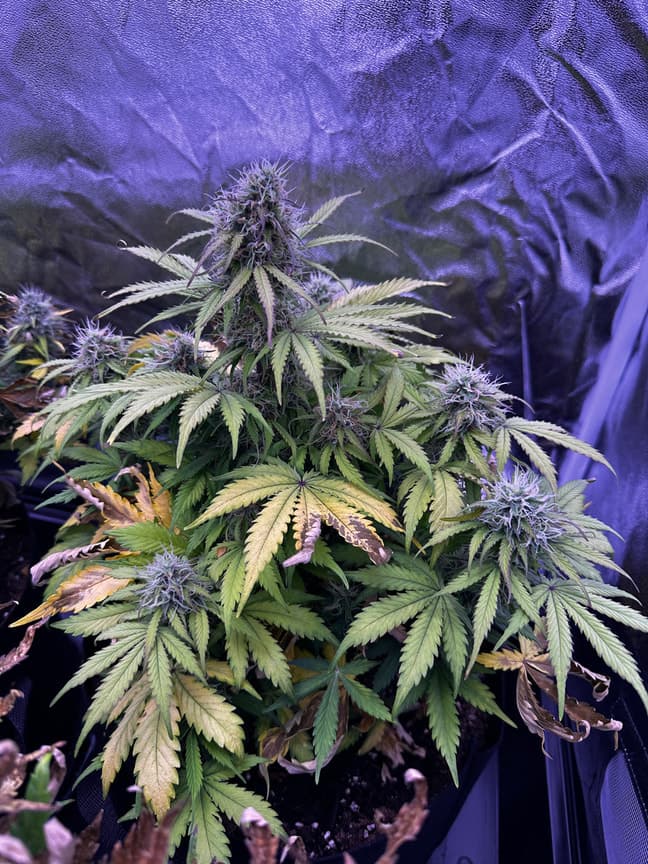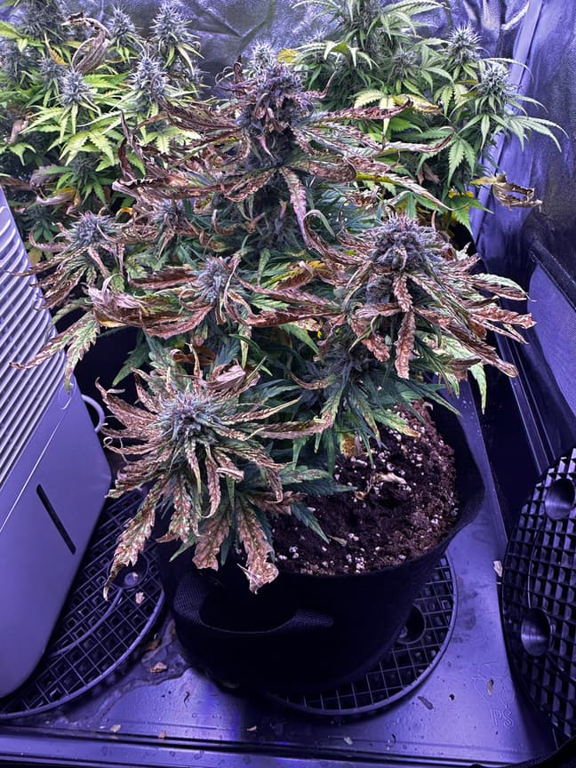 das hier ist mein erster Anbau und 1 meiner 3 Pflanzen (alle in der selben Growbox) hat seit 4 Wochen komische Flecken an den Blättern diese werden trocken.