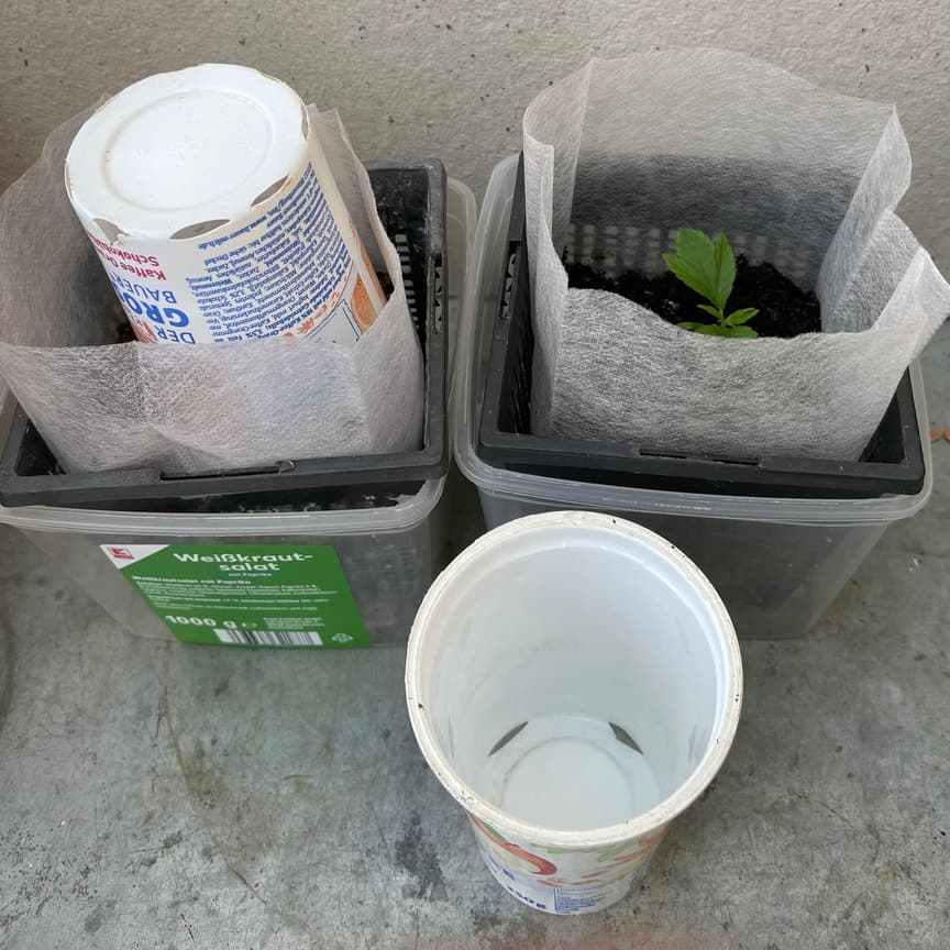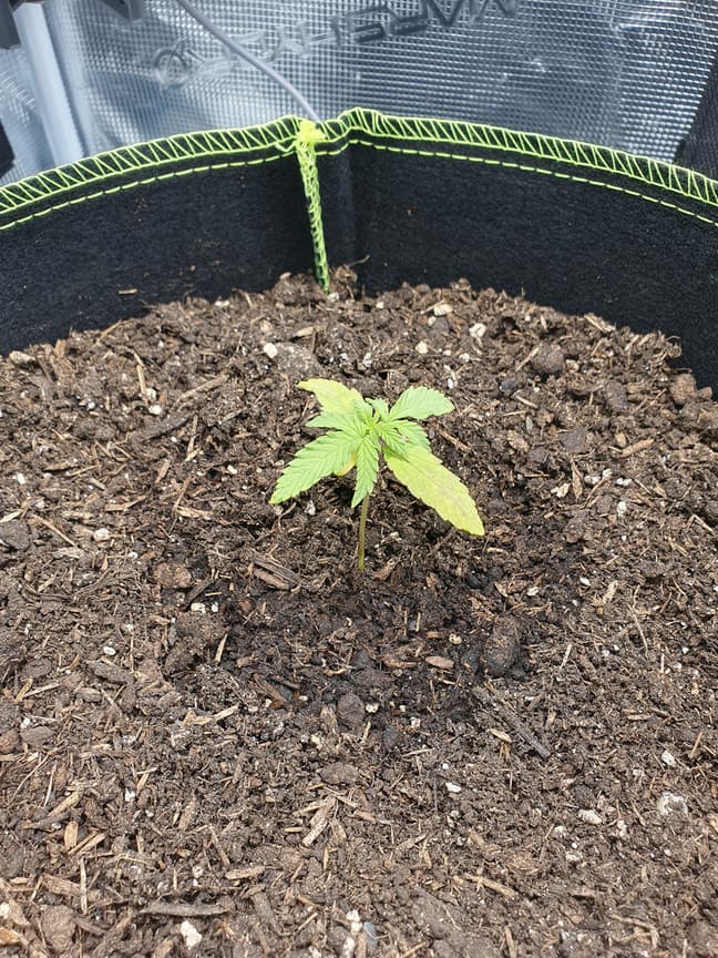 Eingepflanzt gleich in 15 L Stofftöpfen und nach der Keimung mit Root-Juice (BioBizz) gegossen.