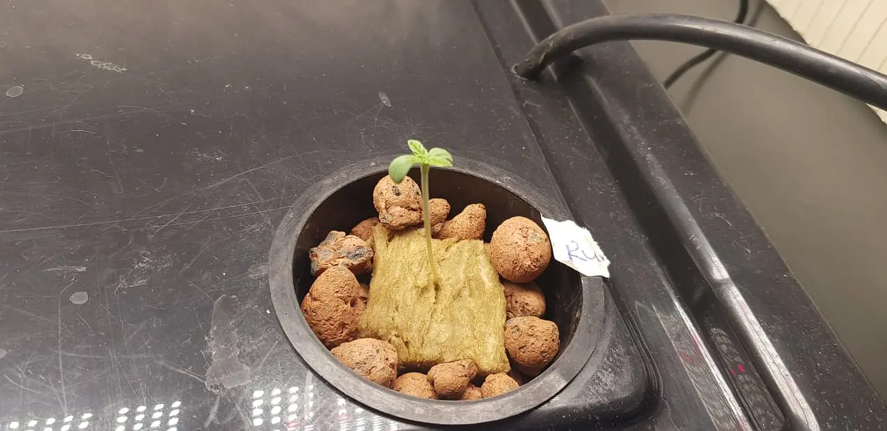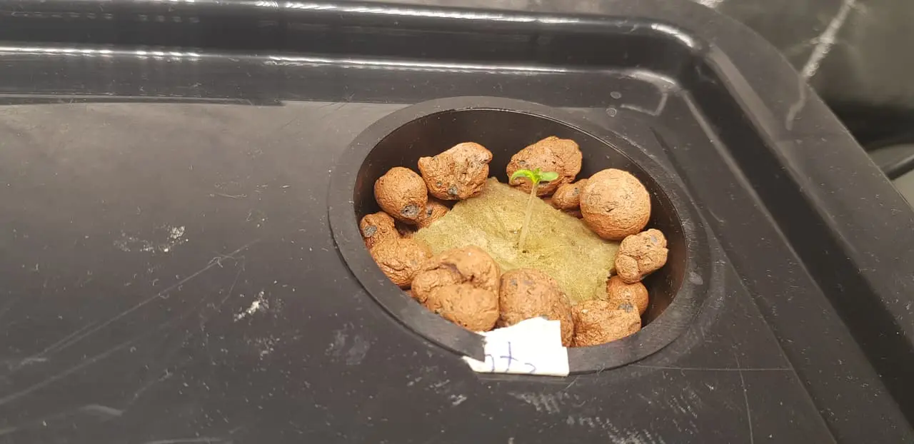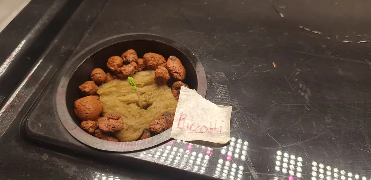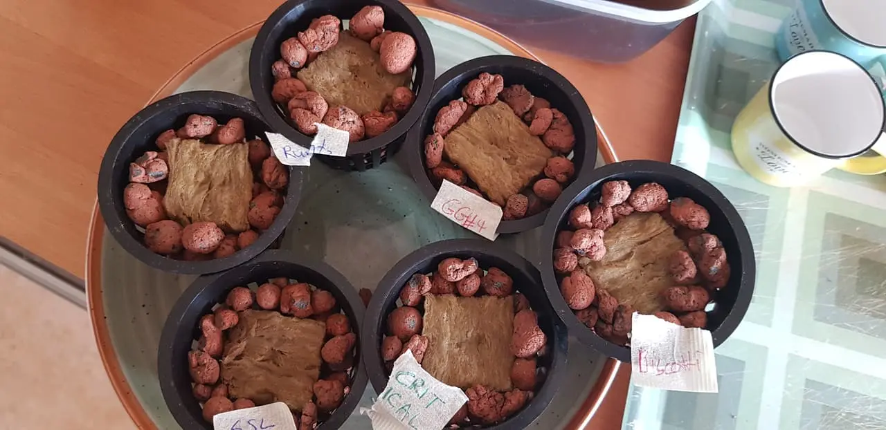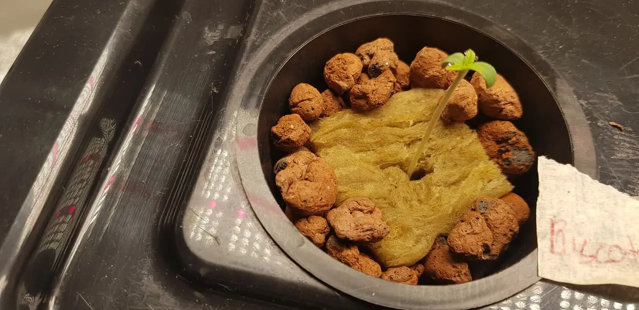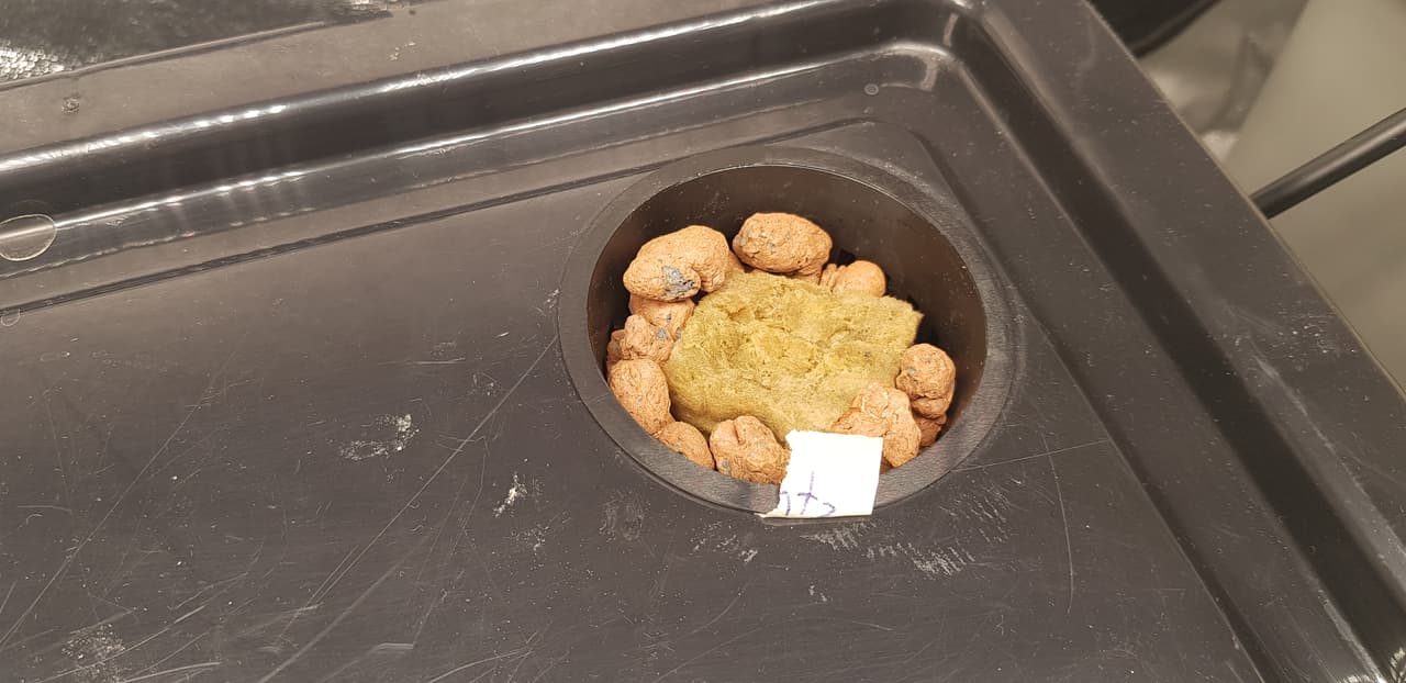 Die Steinwollwürfel wurden in 5,4 PH-wertiges Wasser "eingeweicht", in mit Löffelspitze TNC Mycorr Hydro und Green House Feeding Bio Enhancer angereicherter Lösung, in welchem ich ich 100ml einen seit 6 Tagen mit T.A. Silicate zubereitete "Lösung" hinzugegeben habe. Wasser ist 50/50 RO/LW. EC: 0,550mS.