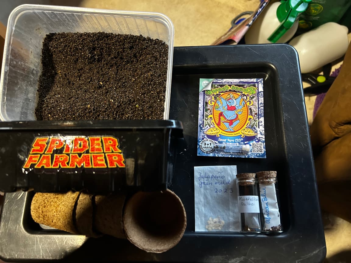 Um die Fläche zu nutzen wurden auch noch Jalapeños, Muskelkatersalbei und Basilikum der Sorte african Blue auf die Reise geschickt. SpiderFarmers Minigewächshaus ist somit etwas voller und trocknet nicht so schnell aus. Wasser gab es nur wenig per sprühflasche, da der frische wurmhumus sehr feucht ist. Auf einer Silikonmatte auf der Heizung wird es auch nicht zu warm/kalt und darf jetzt mal zwei Tage vergessen werden…