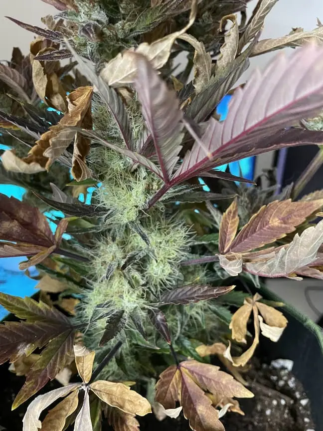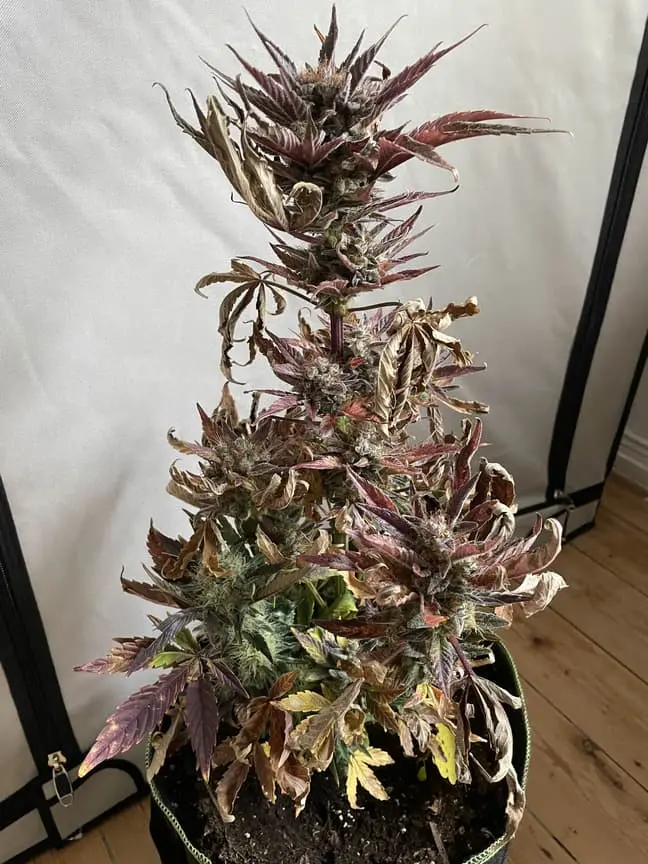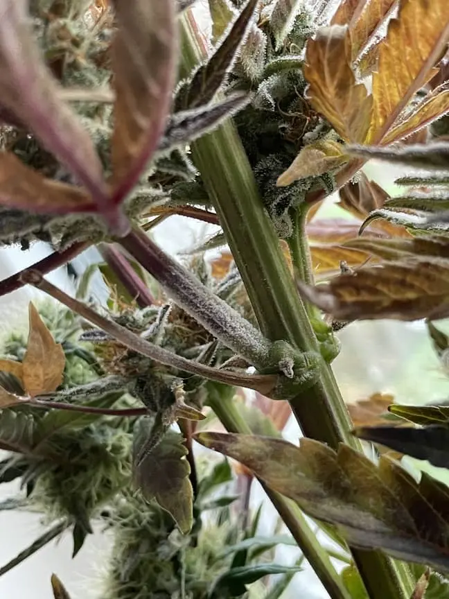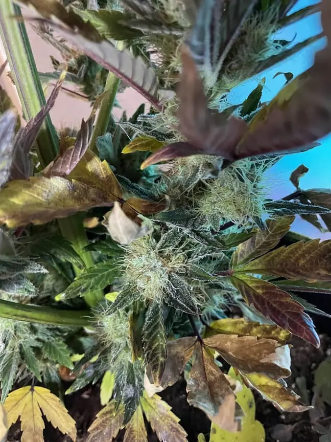 Außerdem wächst die Pflanze super komisch. Oben ist sie von den Trichomen her perfekt. 30-40% der Trichome sind bernsteinfarben, aber unten sind super dicke Buds nachgewachsen die erst später dazu kamen, aber die haben halt noch größtenteils glasige Trichome.