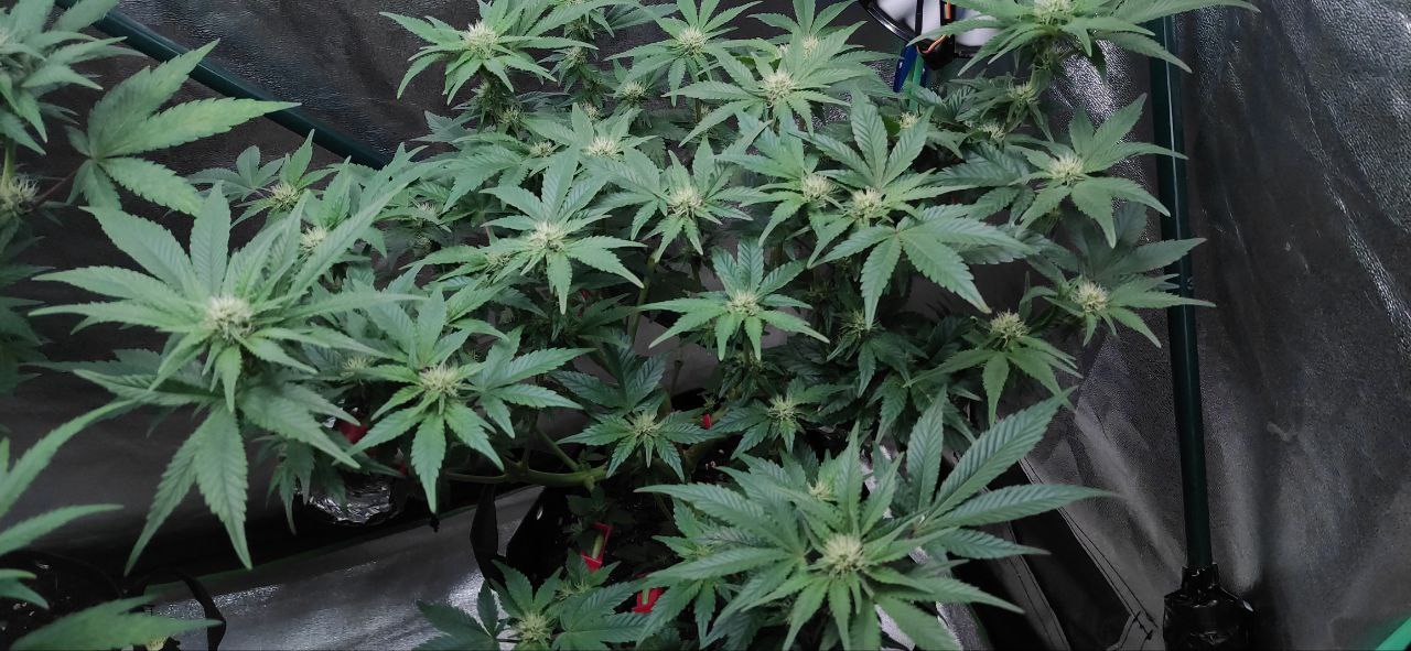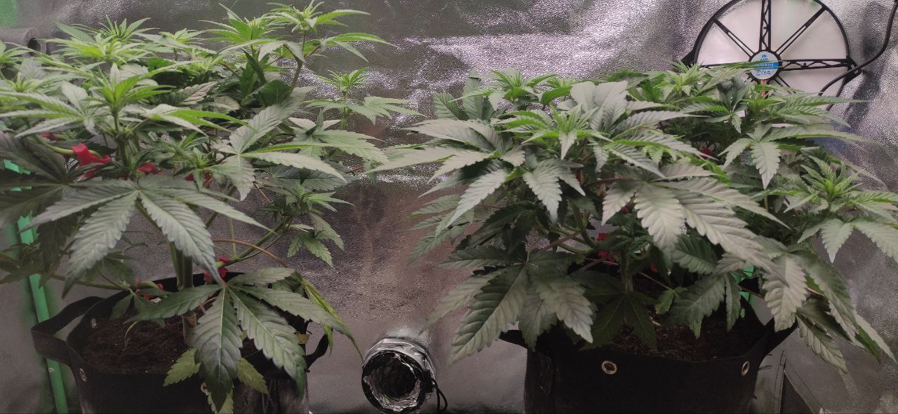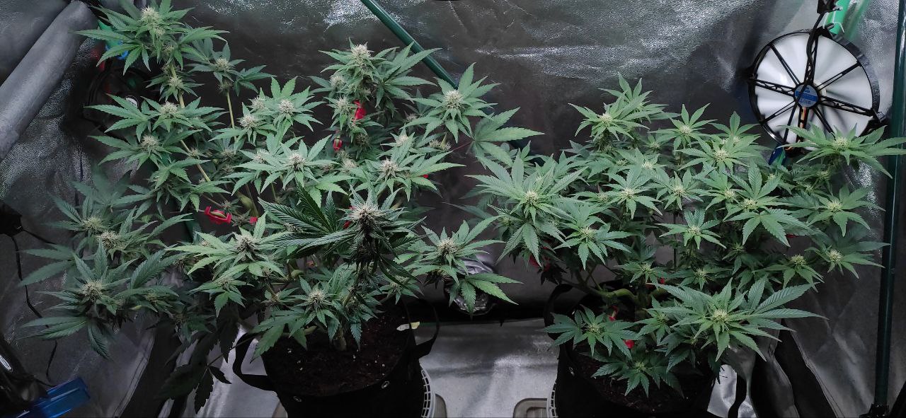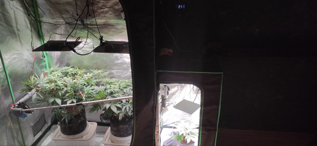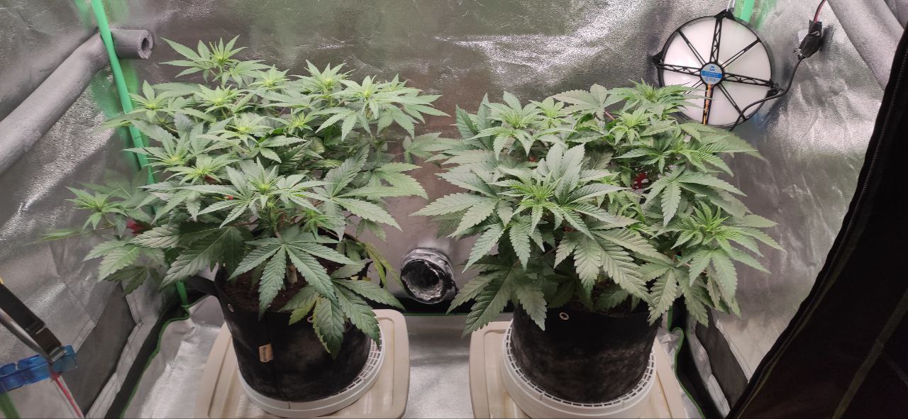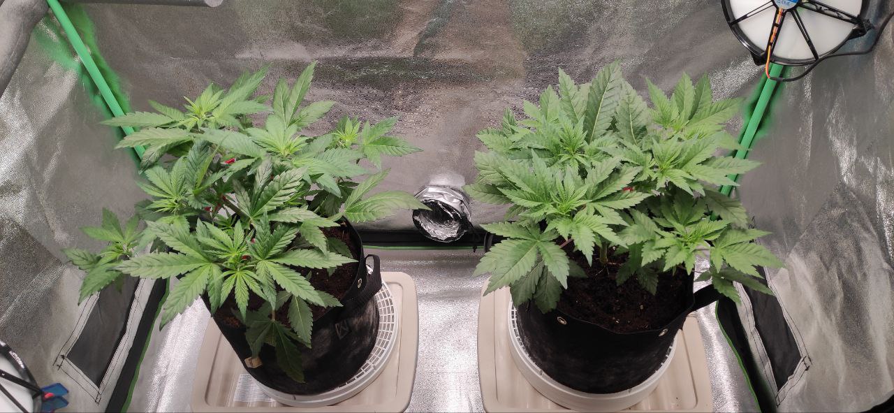 Derzeitige Gießmenge im 2 Tageintervall 2-2,5 Liter. Geplante Entlaubung am 31. Blütetag. Am liebsten würd ich Sie jetzt schon etwas frei machen. (Eure Meinung?) Ansonsten kanns auch mal ohne Licht auf 17° runterkühlen, ist aber nicht wirklich relevant. Bei Sonne schwankts mal zwischen 21-23°. Sind alles in allem Cannabisfreundliche Temperaturen ohne negativen Einfluss von Schankungen/Intervallen. Die RLF ist bei unteren bis mittigen 60% auch immer ein sehr komfortabler Wert. Das schöne an diesem Setup ist das sich die 2 Blühpflanzen ne sinnvolle Fläche zum entwicklen haben.