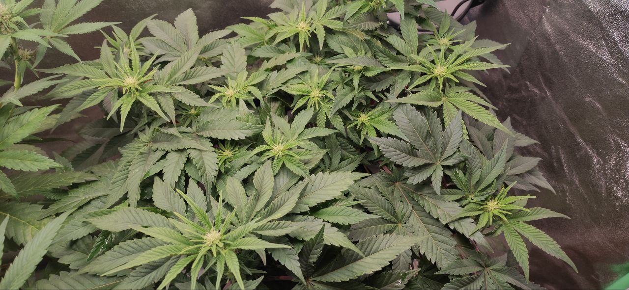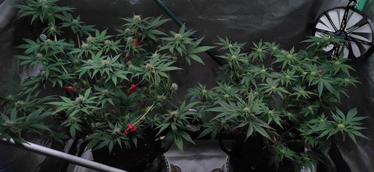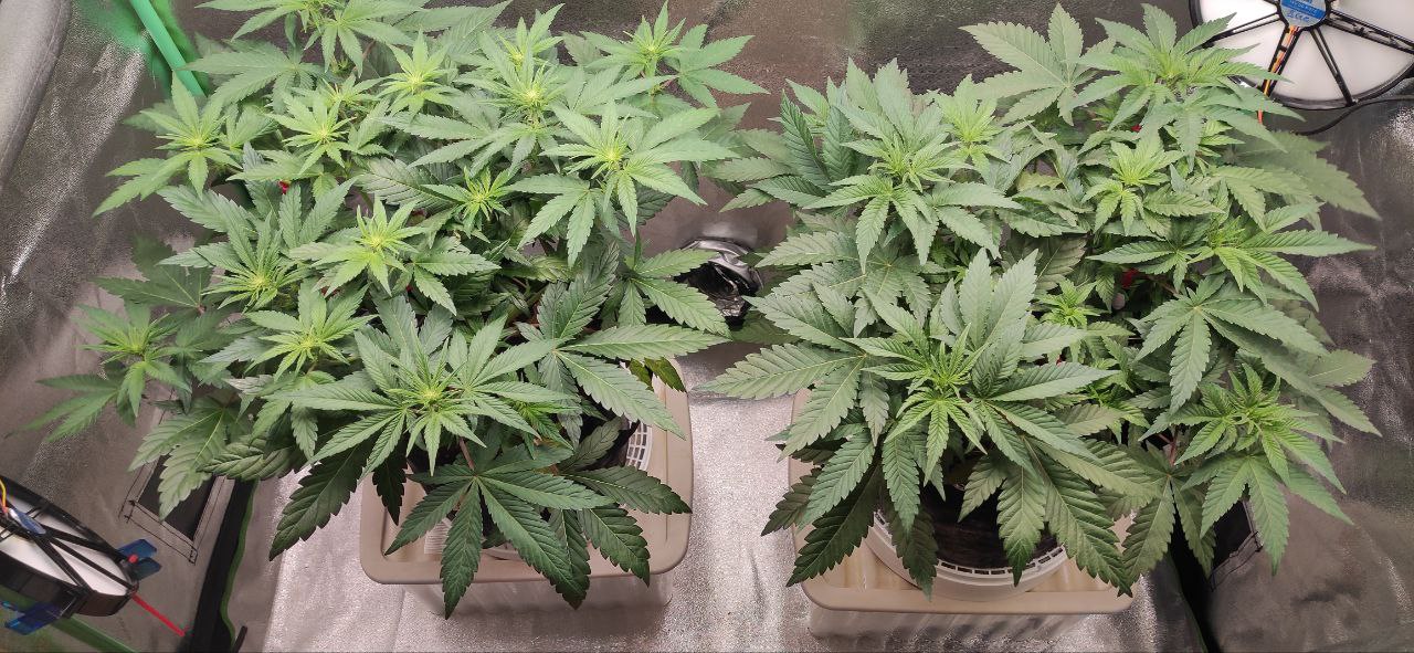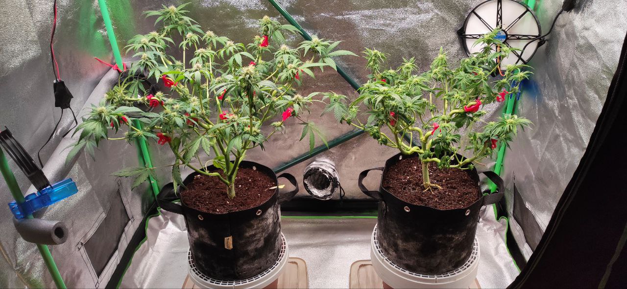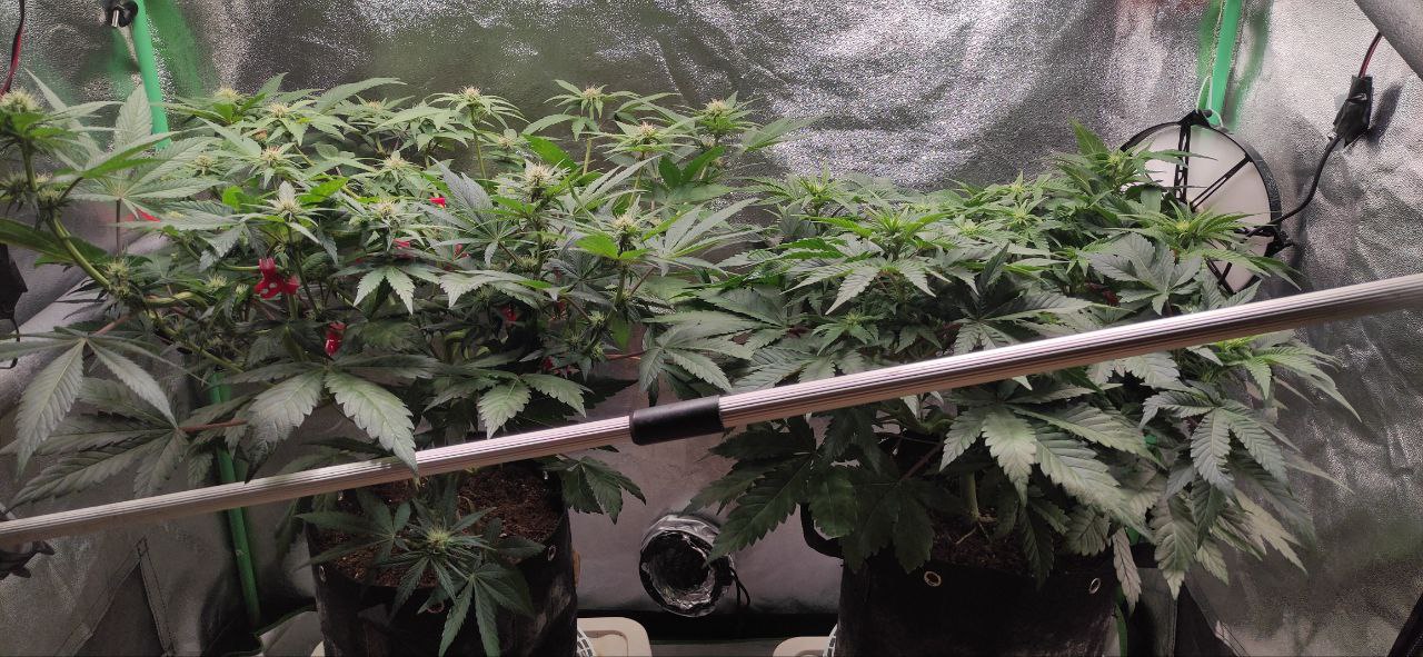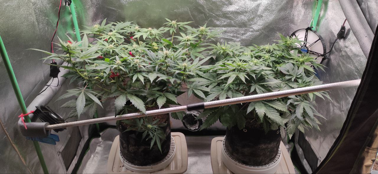 Derzeitige Gießmenge im 2 Tageintervall 2-2,5 Liter. Geplante Entlaubung am 31. Blütetag. Am liebsten würd ich Sie jetzt schon etwas frei machen. (Eure Meinung?) Ansonsten kanns auch mal ohne Licht auf 17° runterkühlen, ist aber nicht wirklich relevant. Bei Sonne schwankts mal zwischen 21-23°. Sind alles in allem Cannabisfreundliche Temperaturen ohne negativen Einfluss von Schankungen/Intervallen. Die RLF ist bei unteren bis mittigen 60% auch immer ein sehr komfortabler Wert. Das schöne an diesem Setup ist das sich die 2 Blühpflanzen ne sinnvolle Fläche zum entwicklen haben.