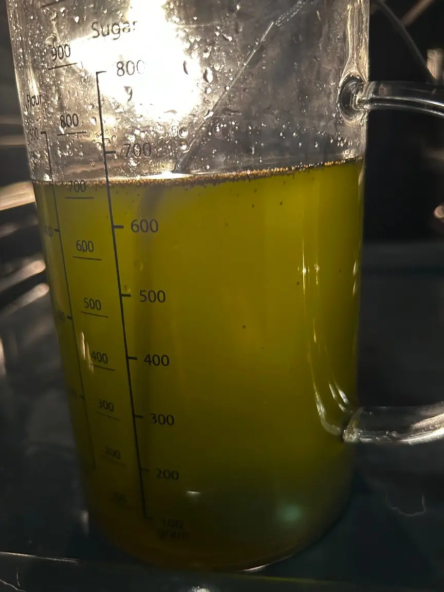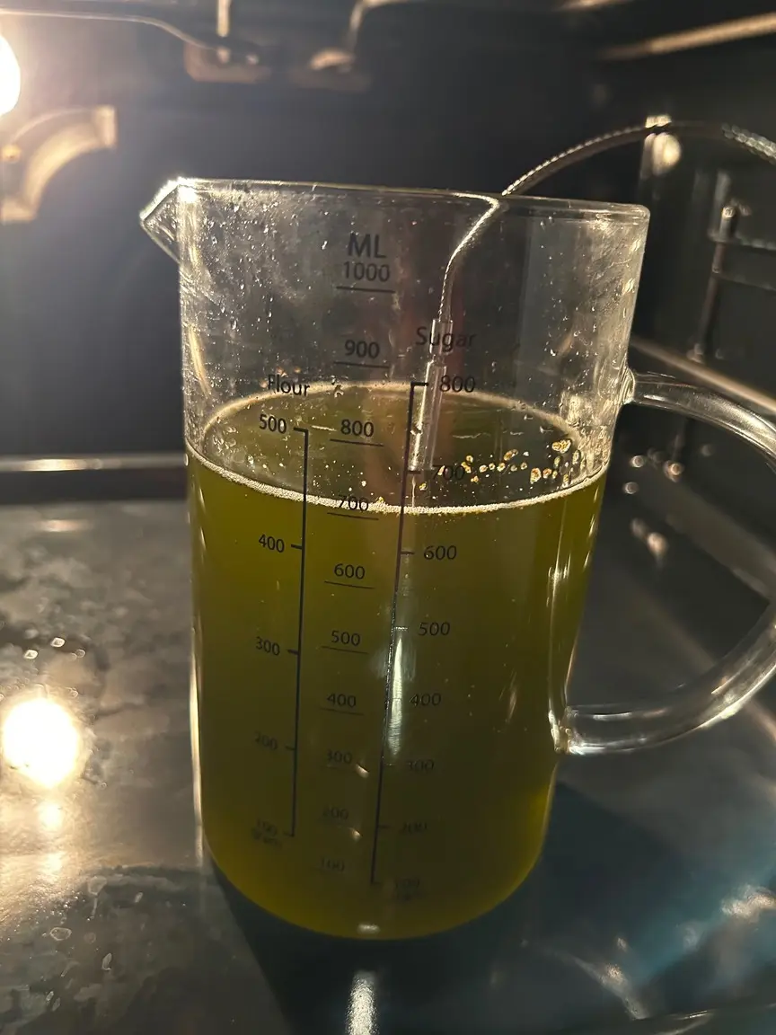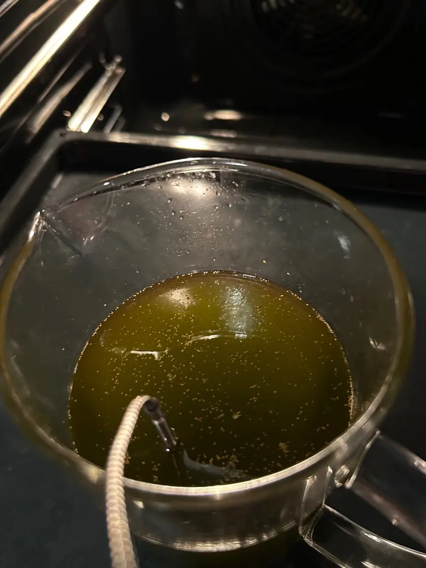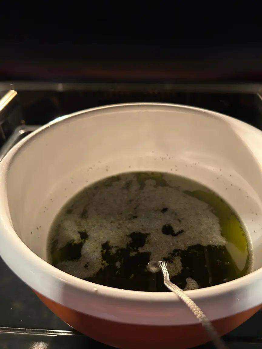 Sobald es wieder auf Temperatur ist, fängt es an zu blubbern. Daran erkennt man den Decarb-Prozess: der zusätzliche Kohlenstoff entweicht als kleine Bläschen.