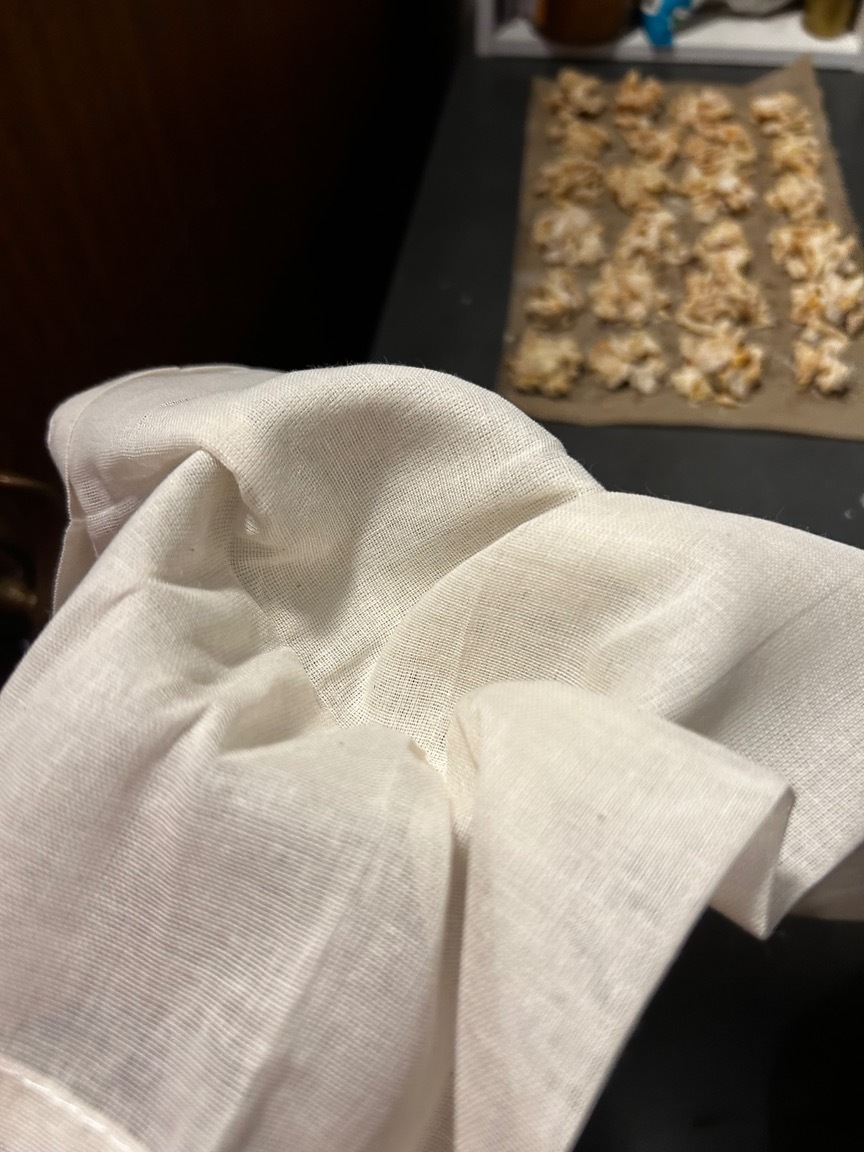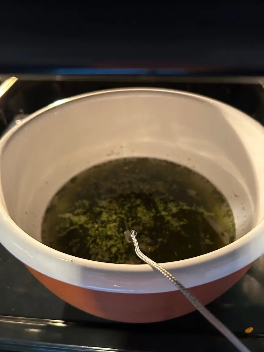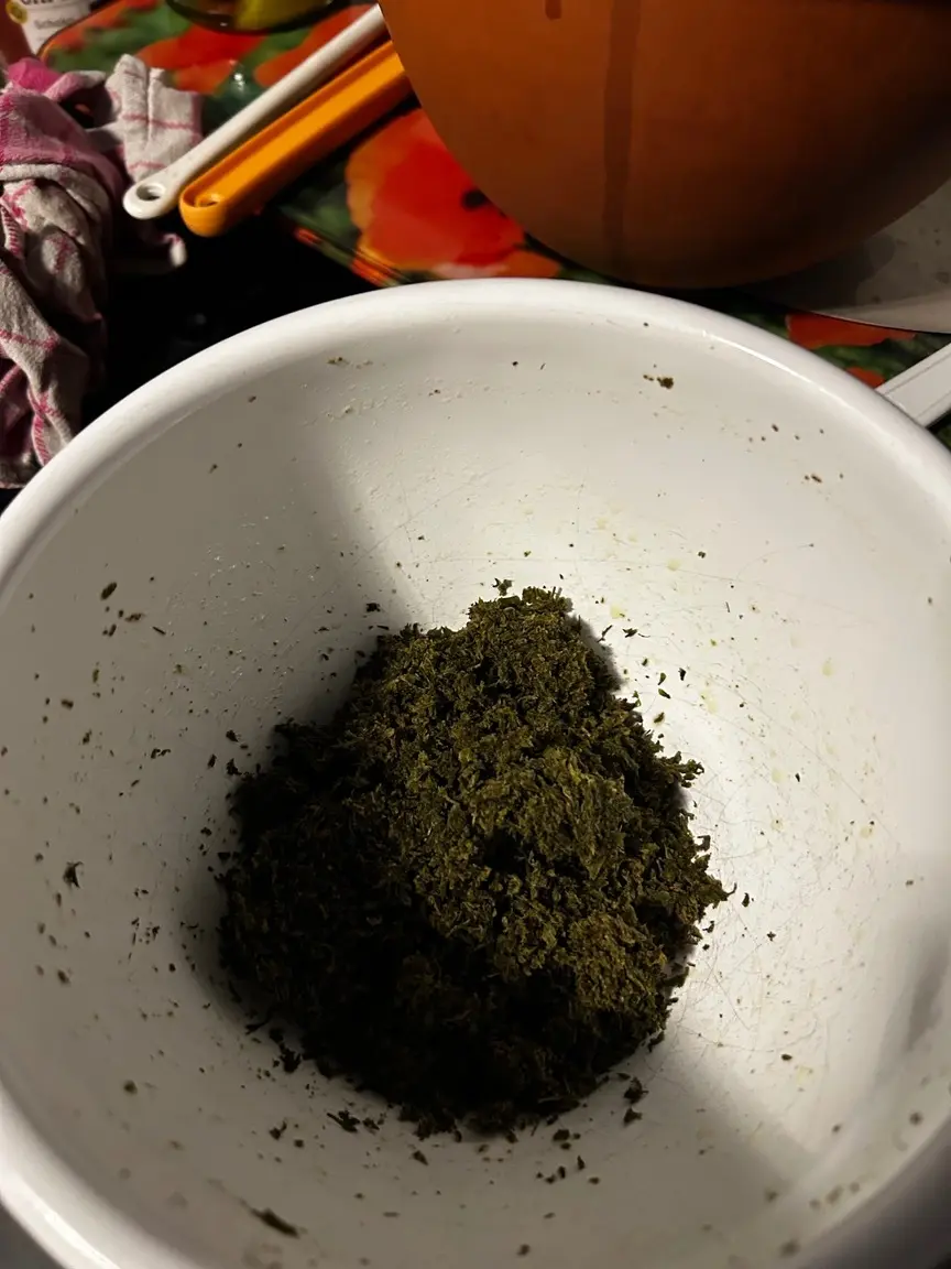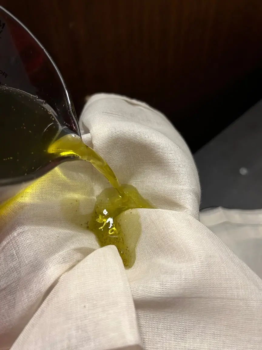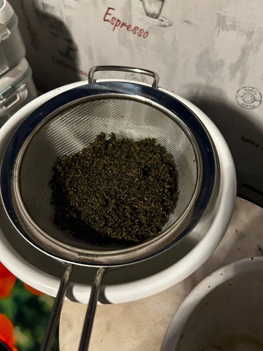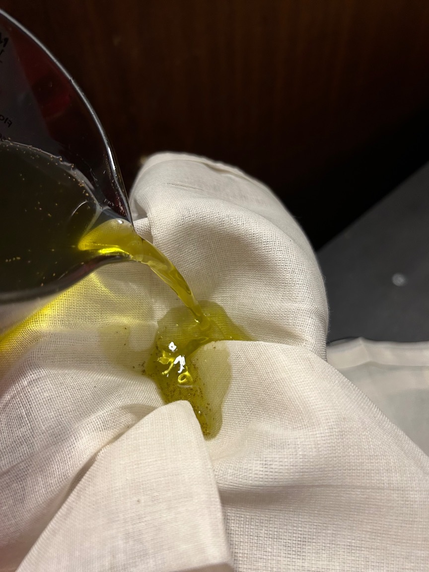 Mit einem Geschirrtuch das Weed auspressen, da waren noch ca 100ml Öl drin…