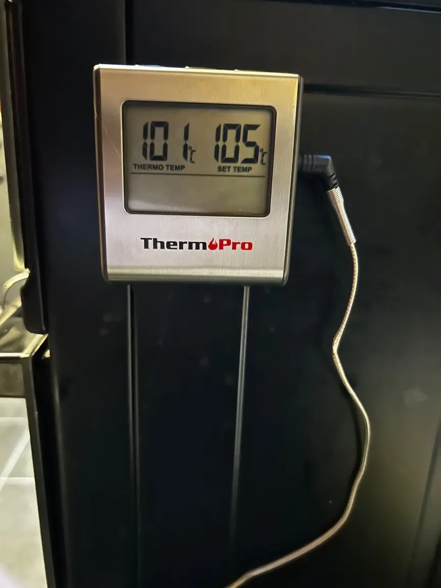 Temperatur ist auf 110 Grad gewesen, Gras eingerührt und es geht runter bis unter 90…