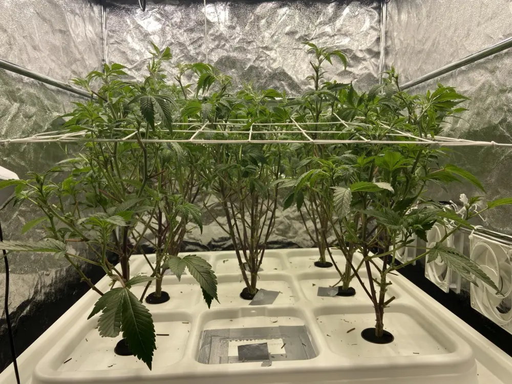 - Viel mehr Sorgen macht mir jetzt zum Blüteanfang die RLF, denn die liegt im Zelt bei 70 bis 85%, obwohl die Luft im Raum nur 45 RLF hat. Deshalb heute erstmal sehr gründlich entlaubt, damit weniger transpiriert wird und sich keine Wassertropfen mehr zwischen den Blättern bilden. So einen Kahlschlag hab ich auch nicht gemacht und hoffe, dass es die Pflanzen gut überstehen:![]()