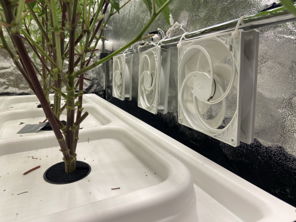 - Bisher habe ich auch noch keine richtige Umluft, sondern nur 3 PC Ventilatoren, die die Frischluft unterhalb der Pflanzen verwirbeln. Diese Woche werde ich aber weitere PC Ventilatoren installieren, die die warme Luft der LED direkt auf die Buds pusten sollen.![]()