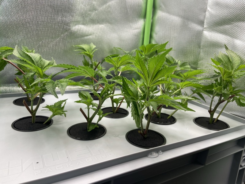 Bei den Muttis handelt es sich um die übrig gebliebenen Stecklinge von meinem jetzigen Grow im Blütezelt. Da es im Blütezelt gut voran geht, habe ich gestern die Muttis vernichtet und daraus Steckis geschnitten. Bis diese Wurzeln bilden, wird der Growtisch dauerhaft geflutet und dann für die Vegi wieder auf 15/60 Minuten umgestellt. Da ich im Blütezelt nicht viel Höhe habe, habe ich versucht, nur kurze kräftige Steckis mit Seitentrieben zu schneiden: