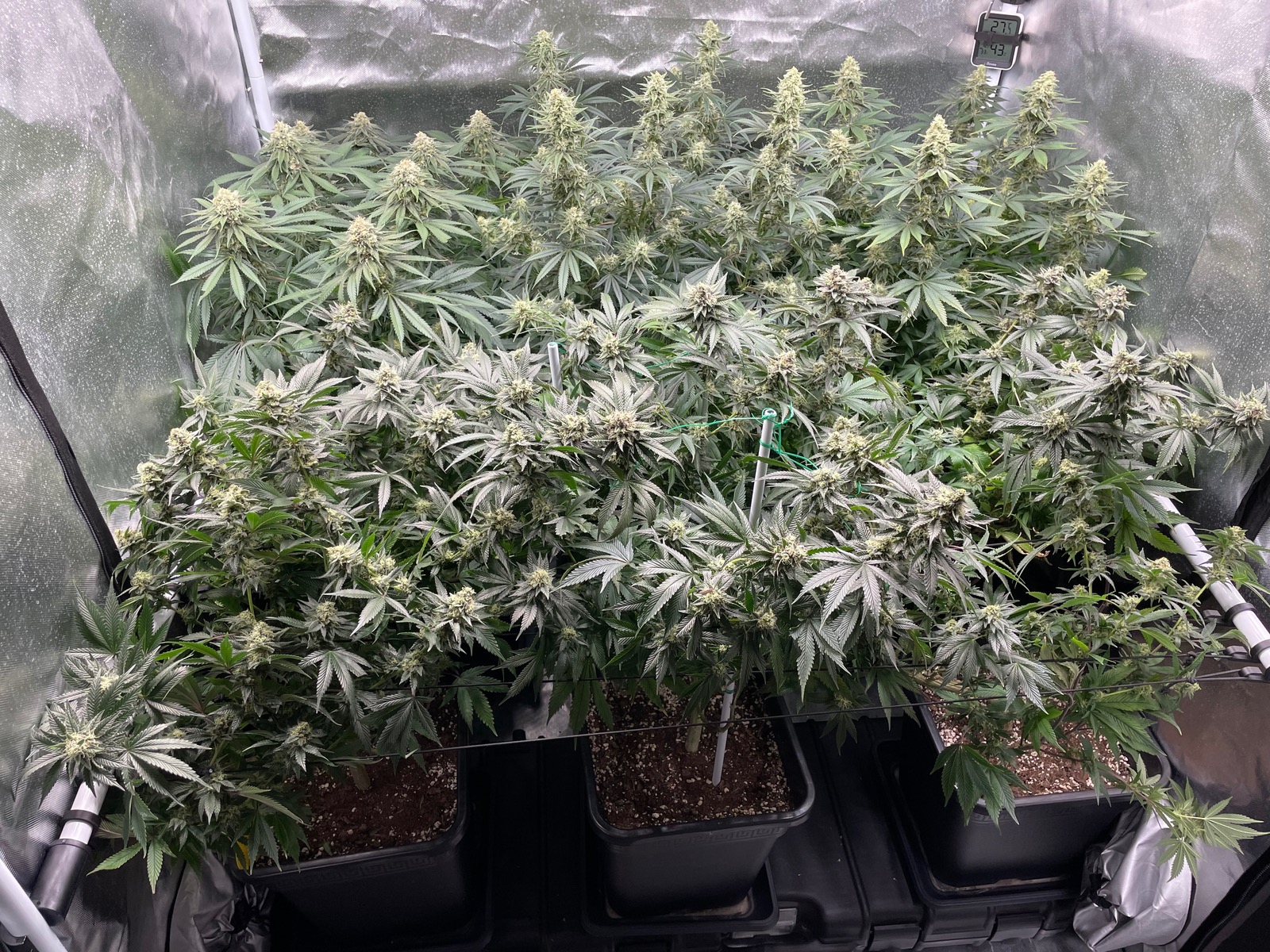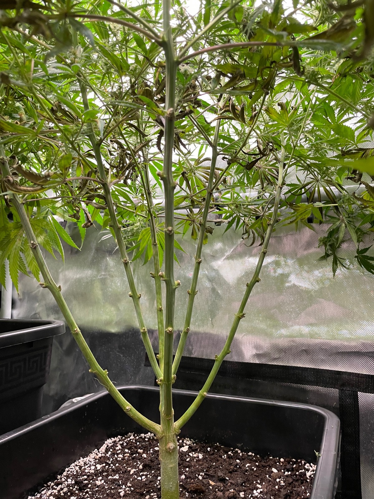 Bin teilweise bei 2,5kPa, ließt überall 1,6kPa ist der Gefahrenbereich. Hab leider momentan wegen den Wetter im Zelt gute 30 grad und Versuch 48% RLF zu halten weil es doch sehr voll ist und ich Angst wegen Schimmel habe.Hab mal zwei Bilder von unten der Pflanze gemacht damit man sieht sie soll sich das schon auswirkt. Kann leider jeden Tag Blätter raus sammeln sind jetzt in der 7 Woche und bei RQS ist angeben 9-12 Wochen.