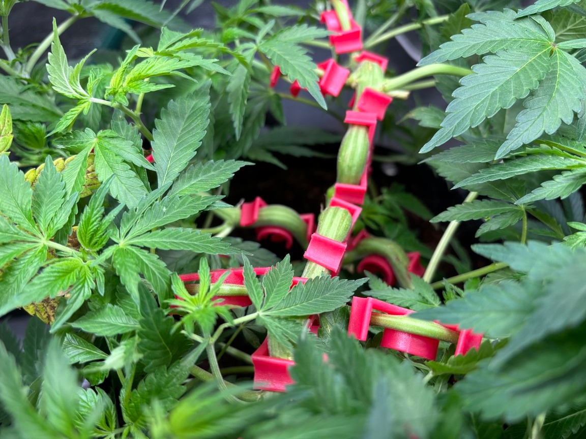 Das, wo du die drei Nodien unter der Spitze 90 Grad biegst, den nach unten zeigenden Ast von der dritten Nodie entfernst und anschließend, wartest bis die restlichen drei, wieder drei Nodien zum biegen haben. Das Seitengeäst von der mittleren Nodie und überhaupt alles unter den Hauptästen, kannste dann in der zeitigen Blüte komplett entfernen, weil so wie du die zum zweiten mal biegst, geht die auch in die Blüte.
