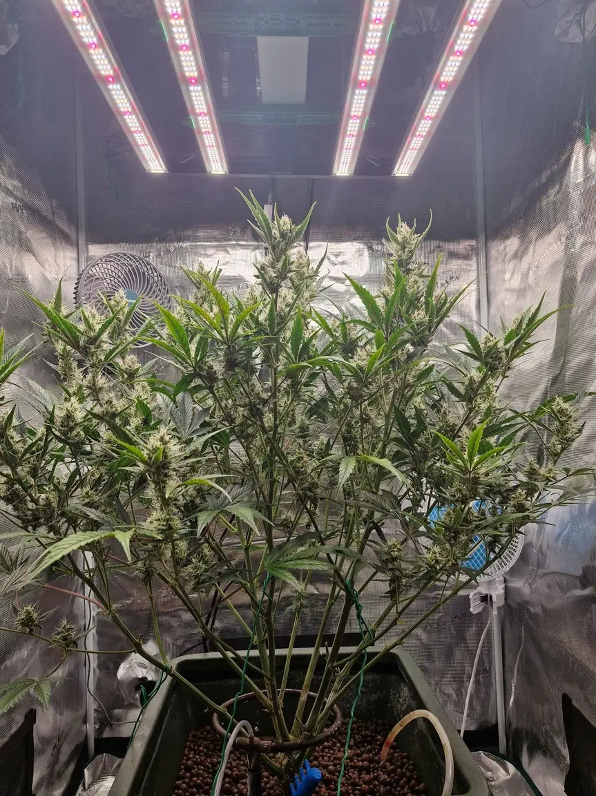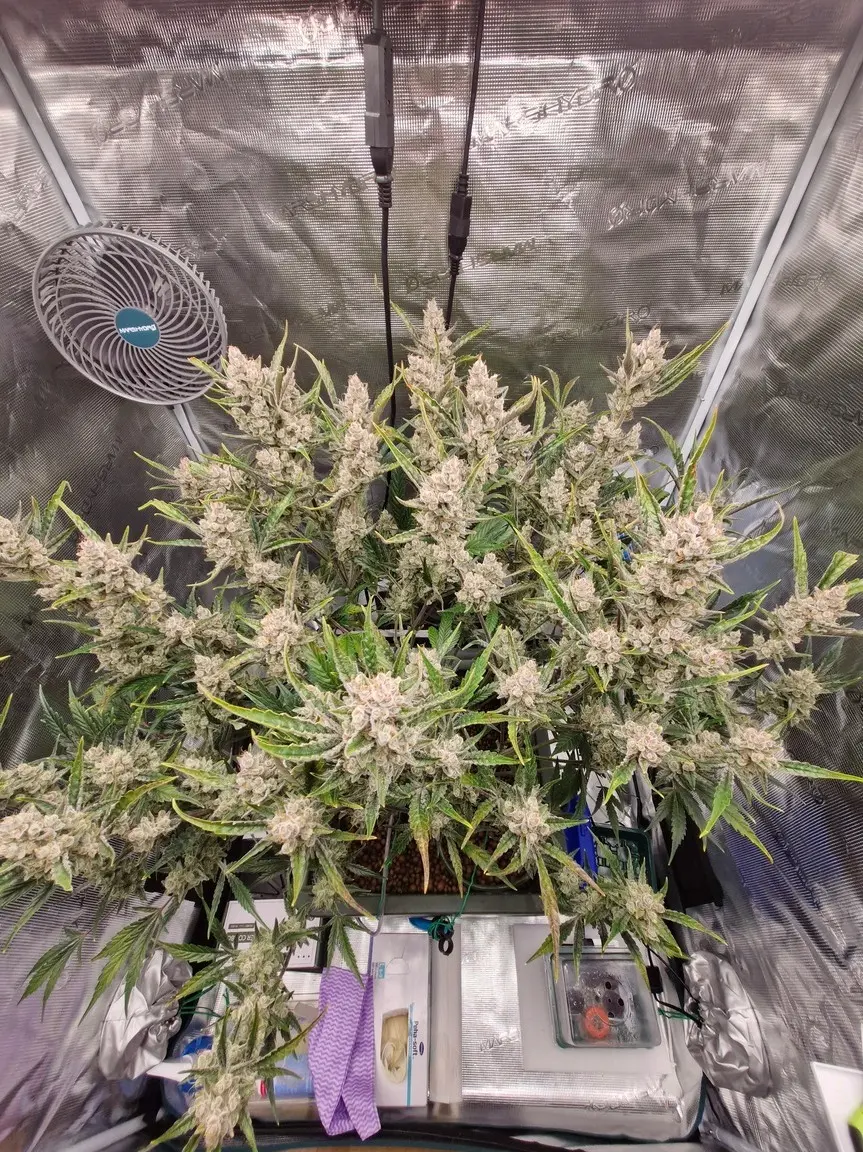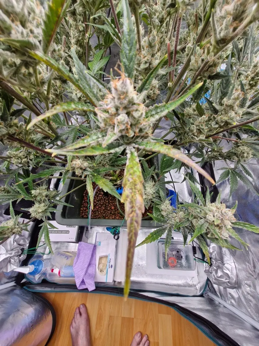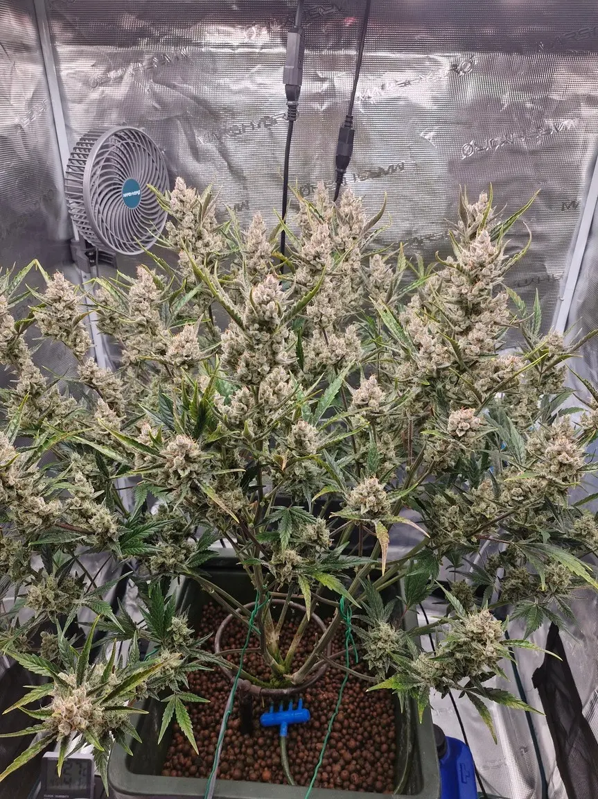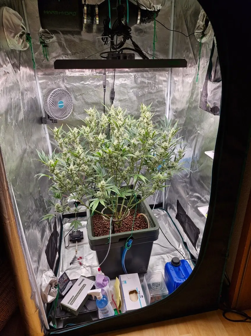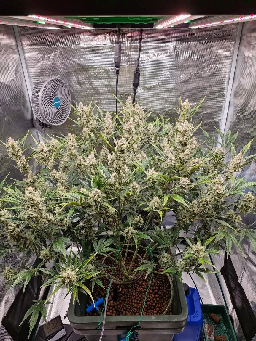 Als die Epsilon im Zelt gestanden hat, habe ich dazu eine Gorilla Cookies Automatic von Fastbuds in der Aquafarm zeitlich versetzt gepflanzt. Diese ist pünktlich zur Ernte der Epsilon in Blüte gegangen und hat noch ca 4 bis 5 Wochen vor sich.