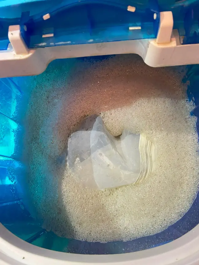 Nach dem Rühren Kippe alles in den 220 Mikron Zip Beutel und schmeiß das ganze samt Wasser und Eiswürfel in die Waschmaschine. Achte darauf das du den Schlauch eingehangen hast xD. Gib gleich neue Eiswürfel dazu und stell auf 15 min ganz entspannt kannst du dir ein bauen gehen