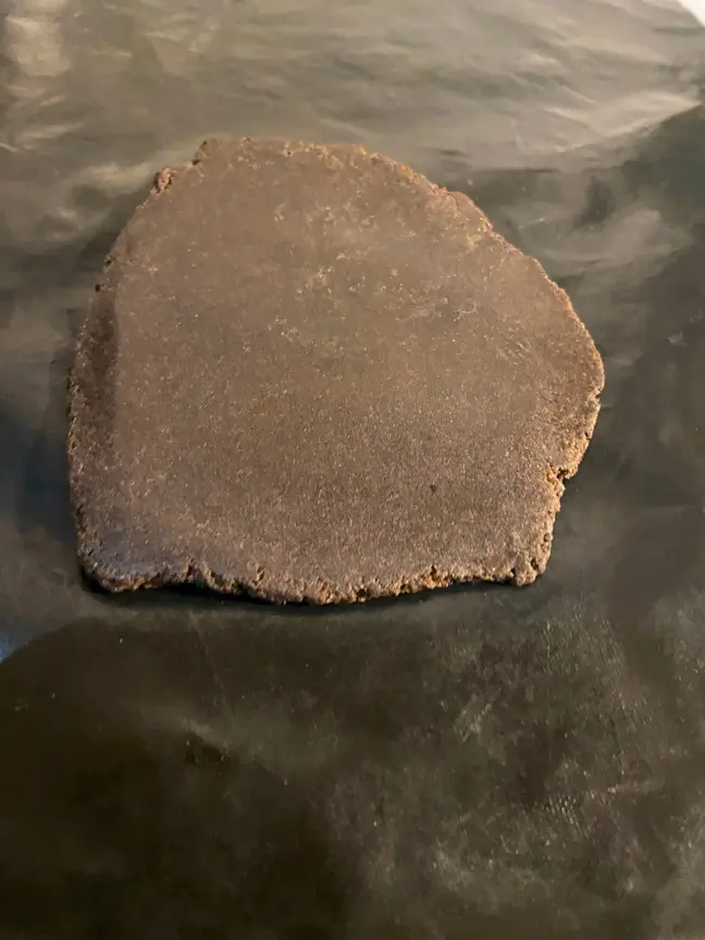 Material auf Teflon Papier geben mit den Fingern etwas zusammen Drücken so gut wie es geht, einmal Falten und mit Nudelholz Plattwalzen