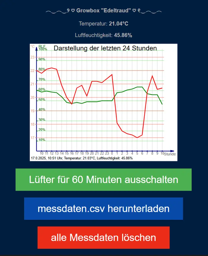 Beide Boxen sind mit einer DIY-Abluft aus PC-Lüftern ausgestattet. Zudem haben beide Boxen je einen ESP32 verbaut, über den ich Temperatur und Luftfeuchtigkeit überwache und aufzeichne. Zukünftig soll auch die Abluft damit automatisch gesteuert werden, um einen noch größeren Einfluss auf das Klima in den Boxen zu gewinnen. So wie jeder Router/DSL-Modem sind die Boxen im heimischen WLAN über ihre eigene Website aufrufbar. Die Websites dazu sehen aktuell so aus: