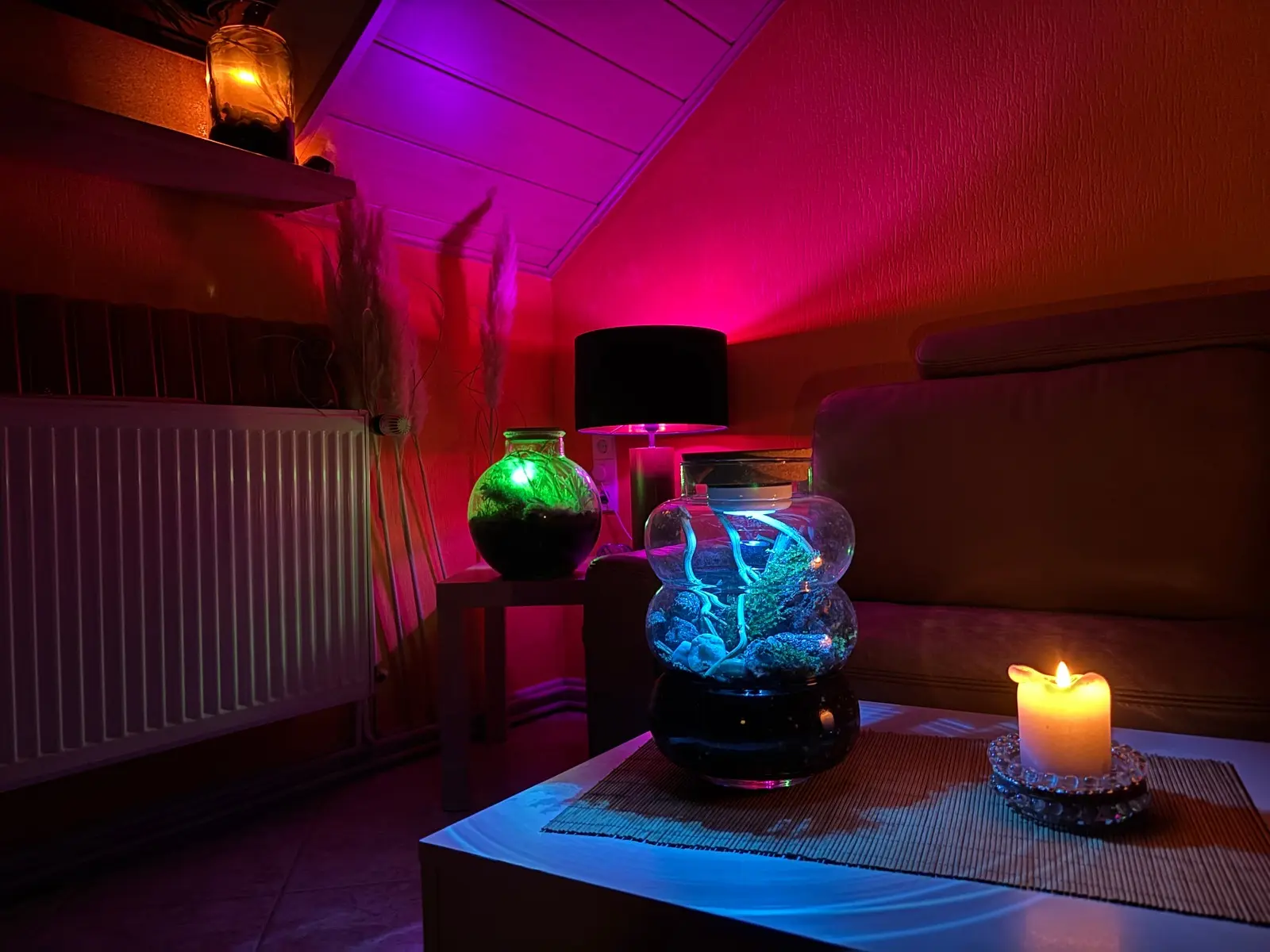 Hab zwei Wassersäulen mit Pflanzen und ein paar Blasenschnecken nur Wasser drin und Licht mehr braucht es nicht .Kein Wasserwechsel nur mal ein schwups nachgießen.🤓
