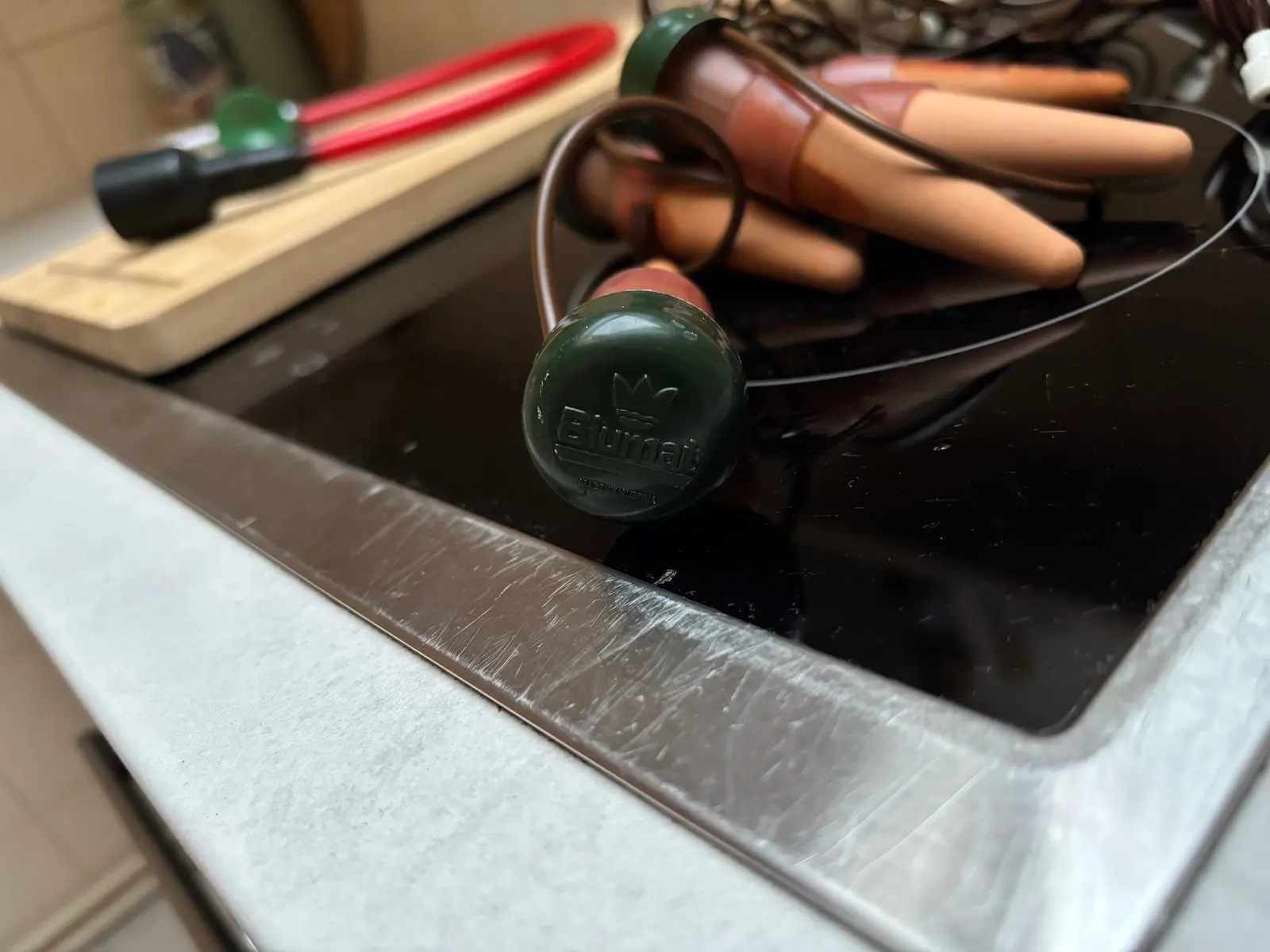 Versuche es mal ,wie ich ,Heißes Wasser ein Teelöffel Oxy Aktion oder ähnliches in ein Schüsselchen ,einfach reinlegen und abwarten. Ohne schrubben einfach abtrocknen fertig.🤓