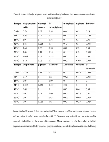 Terpenes such as caryophyllene oxide (average content among all the drying conditions is 0.16%