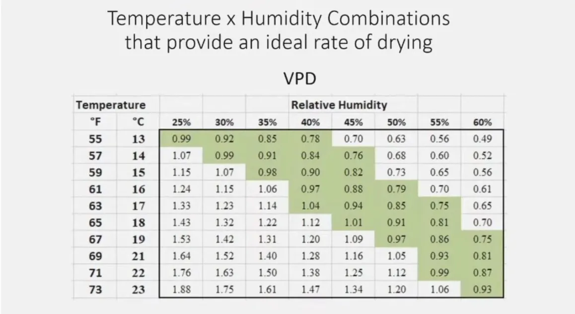 By slightly adjusting the VPD higher, to transition to our second phase of drying, will help pull that inner moisture closer toward the surface where we want to once again increase the pressure to equalise the evaporation rate. By implementing this method, we reduce the the oxidative stress of a dehydrated surface layer for extended periods, while maintaining a consistent diffusion rate through the whole process.