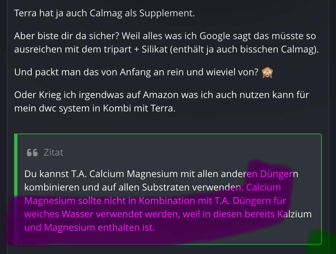 @Pan deine Wasserwerte werden schwanken, wenn du dein Wasser nicht komplett aus der UO Anlage ziehst🤗 Vor allem zwischen Sommer und Winter schwankt das, weil im Sommer der Verbrauch höher ist. Das merkste dann daran, dass deine Plants im Winter nicht mit dem Schema aus dem Somer klar kommen. Nicht gar nicht, aber du siehst es mindestens auf der Wage, vermutlich auch an undefinierbaren Flecken auf dem Blatt.