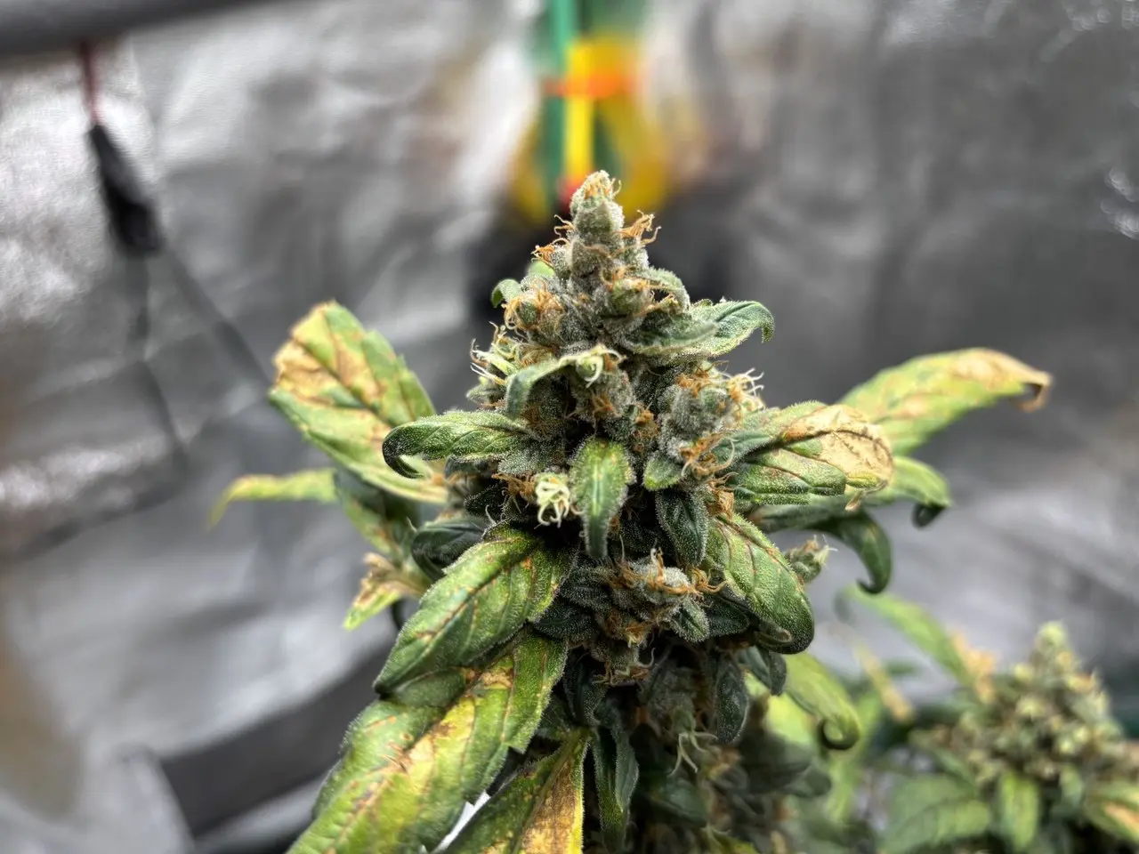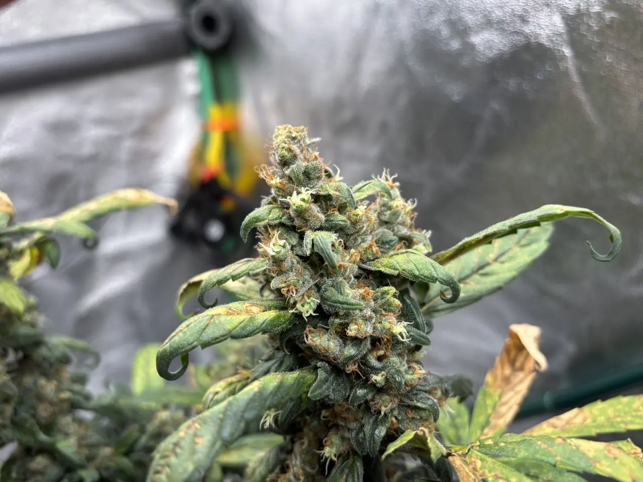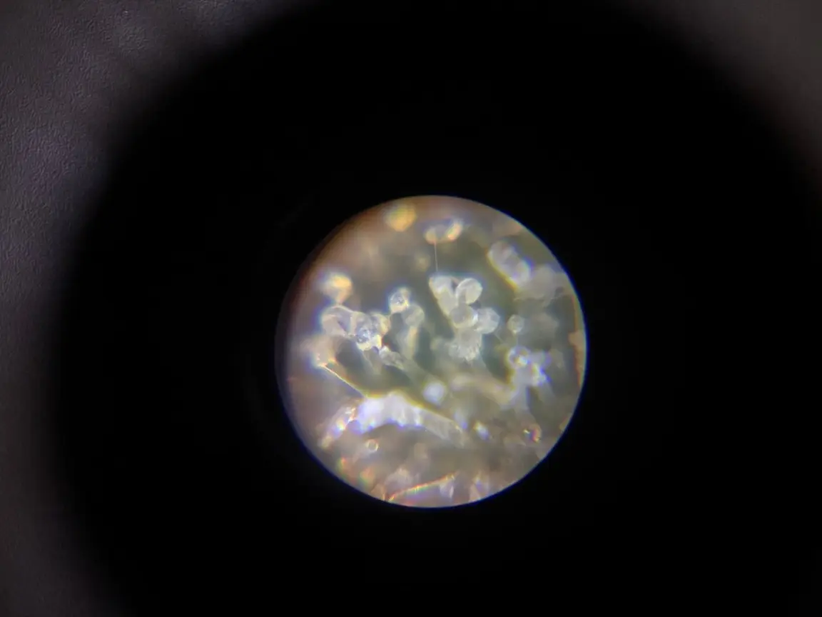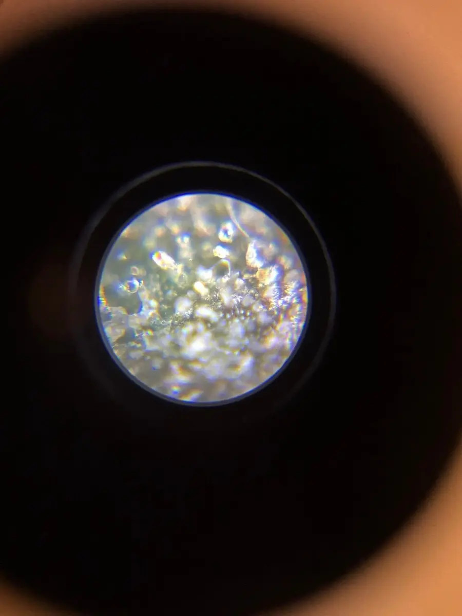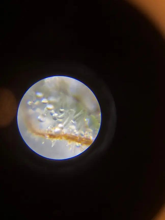 Gießmenge hat sich deutlich in den letzten Tagen reduziert. Gegossen wird ausschließlich PH reg. Wasser. Eine Probe zum Trichomecheck wurde ebenfalls entnommen, seht selbst. Evtl. mache ich heute Abend nochmal eine neue da hier ein Schnitt war an dem mans einfach nicht deutlich erkennt, eine vermehrte milchige Verfärbung ist zu erkennen.... kann also bald soweit sein.