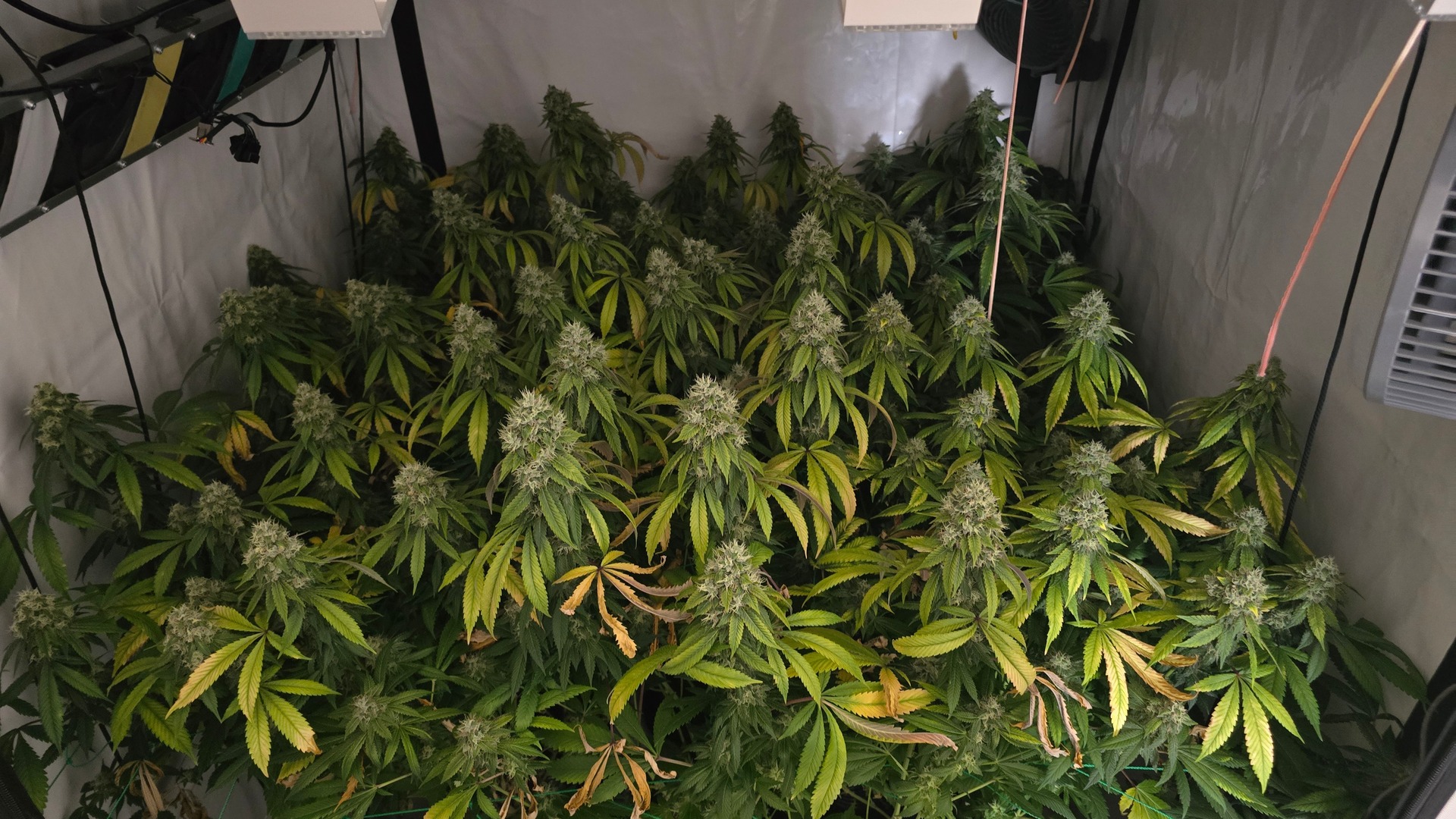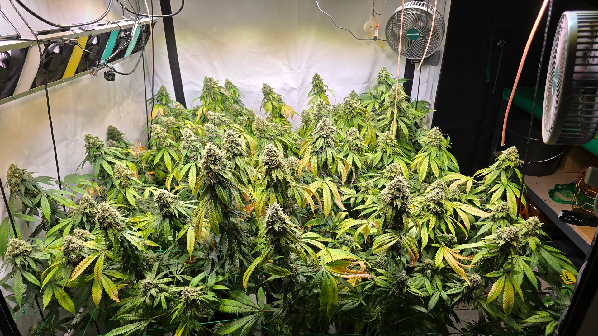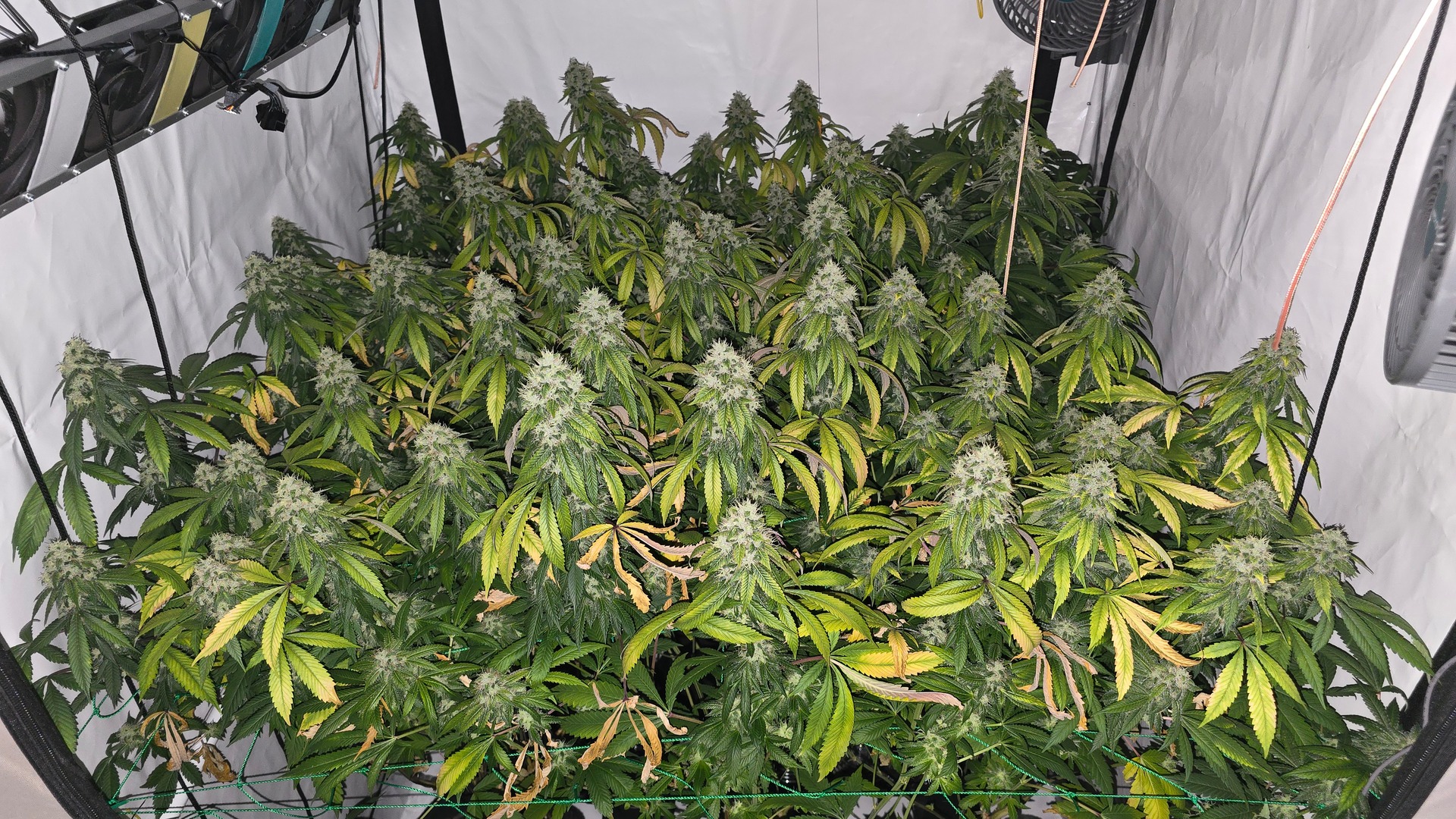 Ich habe 220 gramm geerntet. Und ein Mainbud der die hälfte eines glases ausgemacht hat also knapp 20-30 gramm war komplett weggeschimmelt wegen zuwenig airflow.
