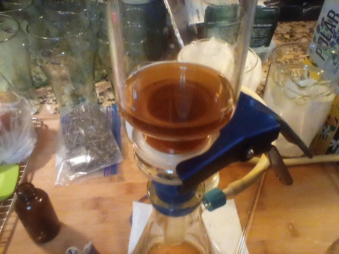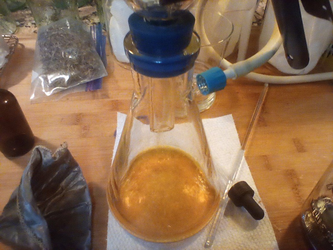 Das ist uns zu teuer, etwas nderes muss her.Ein anderes System besteht darin, die Pyrexschale abzudecken und einen kleinen Ventilator direkt darüber zu platzieren, der Luft ausbläst. Um zu verhindern, dass Partikel den Extrakt verunreinigen, können wir die Schale mit einem Netz oder einem Seihtuch abdecken. Wenn wir keinen Alkohol mehr wahrnehmen, können wir das Pyrexgefäß mit der Mischung im Wasserbad bei etwa 60 °C erhitzen, bis wir den Alkohol nicht mehr riechen (30-60 Minuten). der Extrakt sollte nun fertig sein!