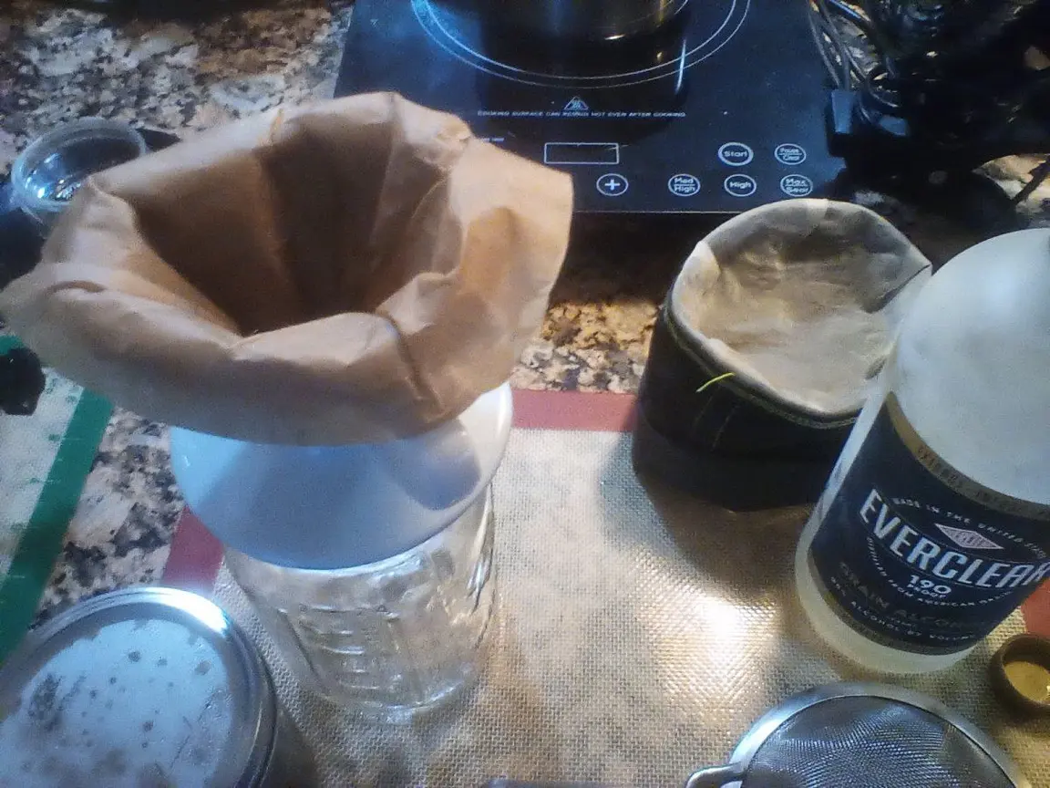 3. Anschließend seihe die Mischung ab so dass der Alkohol mit dem Extrakt in der Pyrexschale zurückbleibt. Der Zweck dieses ersten Filterns besteht einfach darin, die Pflanzenstoffe von dem in Alkohol verdünnten Extrakt zu trennen.